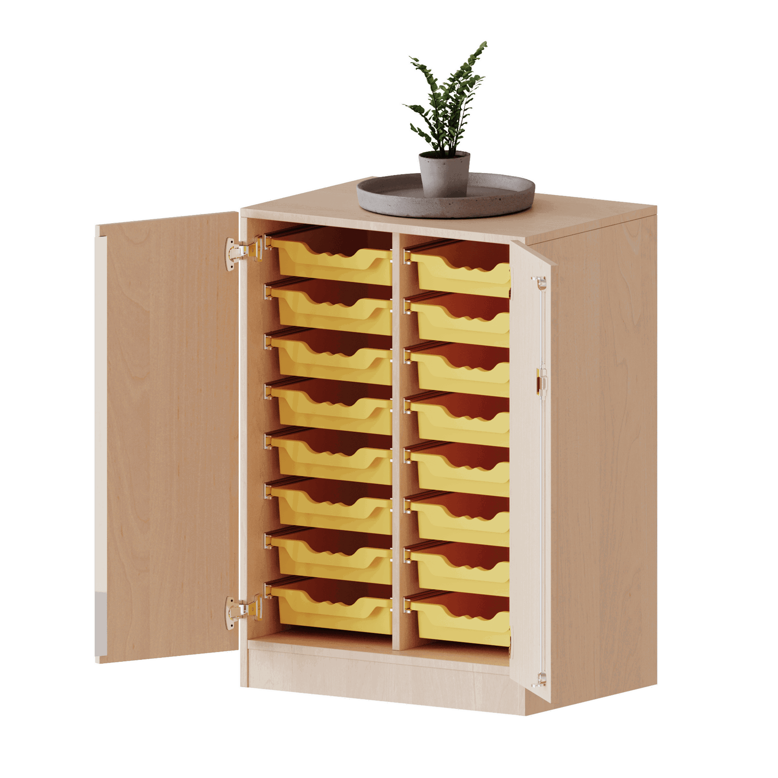 Stellen Sie sich ein Sideboard vor, das maximale Detail-Ordnung und höchste Flexibilität auf kompakter Fläche vereint. Dieses niedrige, zweireihige Möbelstück aus unserer Premium-Serie evo180 ist die perfekte Lösung für die Feinsortierung unzähliger Materialien. Vollständig bestückt mit 16 flachen ErgoTray-Boxen, bietet es auf einer praktischen Höhe von genau einem Meter eine unübertroffene Systematik für Arbeitsblätter, Stifte und Kleinteile. Dank seiner hochwertigen Verarbeitung, der eleganten Sichtrückwand und den drei wählbaren Standoptionen wird es zum ultimativen Allrounder für dynamische Lern- und Arbeitsumgebungen.