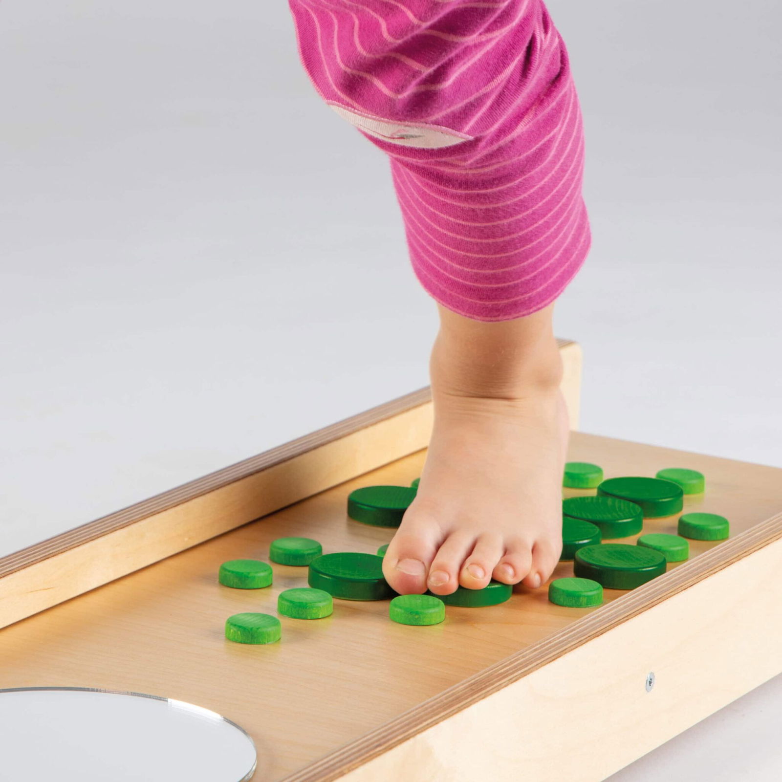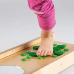 Endlich wieder barfuss laufen – wie am Strand! So soll sich das Brett mit den unterschiedlichen Materialien anfühlen und Füße und Fußsohlen sensibilisieren. Das Brett dient zur Entwicklung der Fußsensorik.