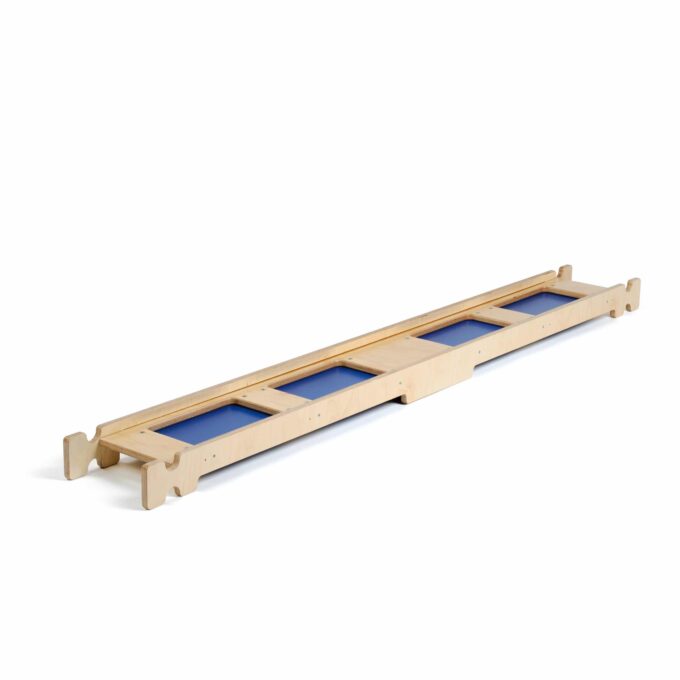 Hier kann man von einer Pfütze in die nächste Pfütze springen, auch wenn man die Gummistiefel vergessen hat. Geht man in normaler Schrittfolge über das Brett, hat man in einem unregelmäßigen Wechsel festen und etwas wackeligeren Grund – somit wird das Gleichgewichtsgefühl und die Stabilität der Fußgelenke gestärkt.