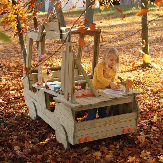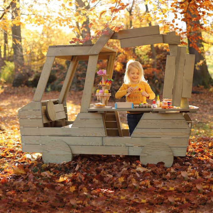 Jetzt kommt unser Foodtruck zu Euch in den Garten. Verkaufen, fahren, kochen und alles, was dazugehört können Kinder hier spielen. Das geräumige Spielauto hat Platz für mehrere Kinder – ob im Fahrerhaus oder hinten an der Theke. Und wenn dann an Herd und Grill leckere Gerichte gezaubert werden, stellen sich bestimmt auch viele Kleine und Große Kinder freiwillig in die Schlange.
