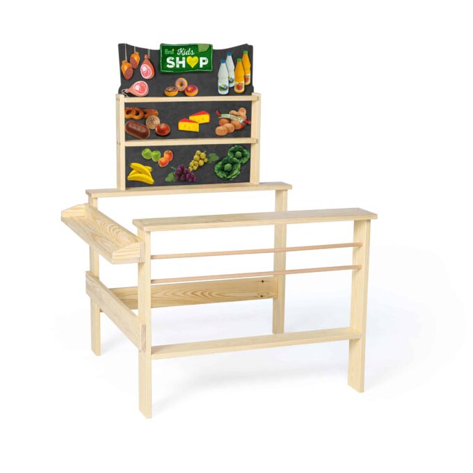 Dieser Kaufladen ist der perfekte Shop für das Kinderzimmer. Durch seine dreidimensionale Bespielbarkeit bietet er Raum für zahlreiche Spielthemen. Kaufen und verkaufen wie die Erwachsenen. Das Spiel des Kaufens und Verkaufens ist ein nie endender Spielespaß für unsere Kleinen. Spielerisch werden Handeln, Kreativität und fantasievolle Rollenspiele gefördert. Der Kaufladen kann durch seine vielen kleinen und großen Regalflächen individuell gestaltet werden.