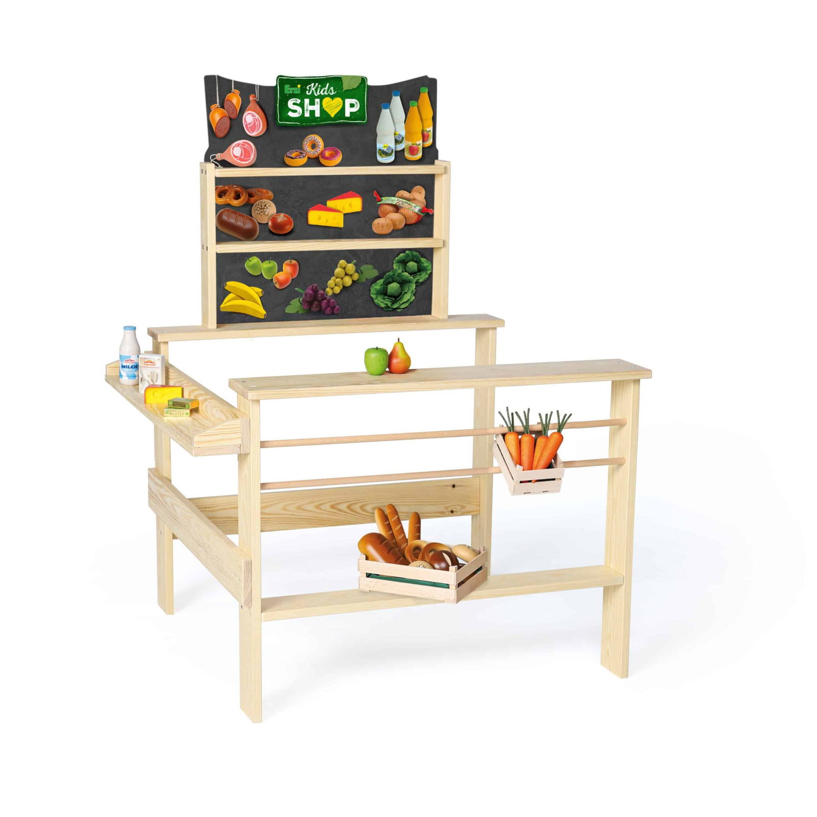 Kaufladen „Kids Shop“ von erzi – hochwertiger Holz-Kaufladen (72 × 79 × 105 cm, Thekenhöhe 57 cm) für fantasievolle Rollenspiele ab 3 Jahren.
