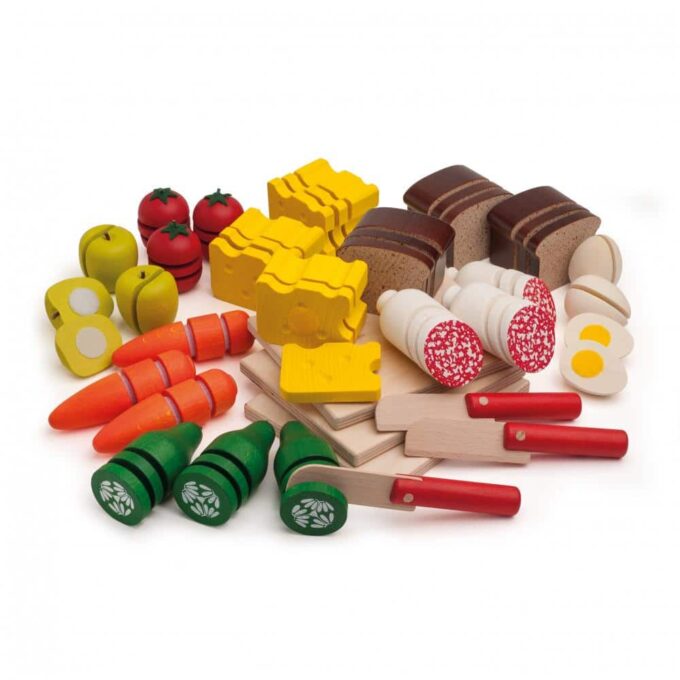 - Inhalt: 3 Schneidebrettchen, 3 Messer, 3 Äpfel zum Schneiden, 3 Brote zum Schneiden, 3 Salamis zum Schneiden, 3 Käse zum Schneiden, 3 Möhren zum Schneiden, 3 Eier zum Schneiden, 3 Gurken zum Schneiden, 3 Tomaten zum Schneiden
