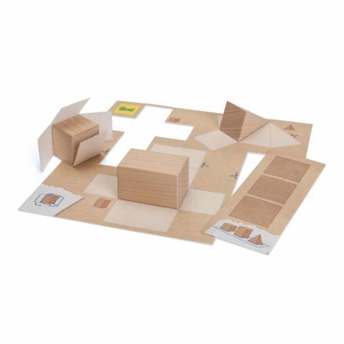 Das Set enthält 6 grundlegende geometrische Körper mit ihren Mäntelflächen. Durch das Spiel eignen sich die Kinder die grundlegenden geometrischen Prinzipien an. Sie lernen die Bedeutung der Formen, die Größe, die Körper und Flächen sowie Symmetrie und Harmonie kennen. Die geometrischen Körper sind aus massivem Buchenholz hergestellt. Sie sind 10 oder 6 cm hoch und haben einen Seitenlänge bzw. einen Durchmesser von 6 cm. Durch Befühlen werden den geometrischen Körpern die entsprechenden Eigenschaften zugeschrieben. Der didaktische Wert wird noch erweitert durch die dazugehörigen Mantelflächen, die ausgeschnitten werden können, um damit die Körper abzuformen. Ebenso können Vergleiche der Seitenansichten und Grundrisse/Stellflächen angestellt werden.