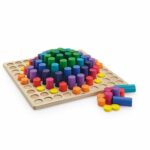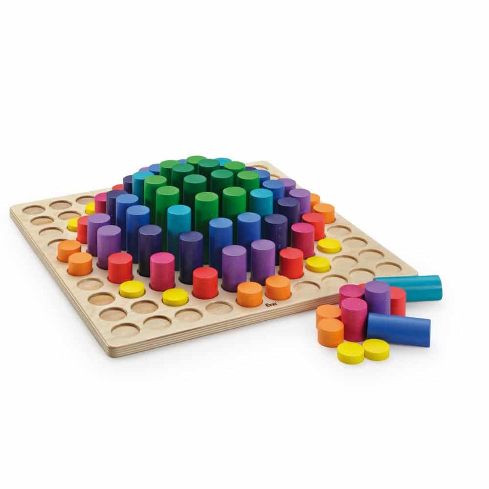 10×10 Zylinder (Ø36 mm) in den Höhen 10 bis 100 mm zur Mengenlehre. Durch das Steckbrett sind diverse Zusammenstellungen und Anordnungen der farbigen Steine von Farbharmonien bis hin zu einfachen figürlichen Darstellungen möglich. Jede Höhe hat eine eigene Farbe, somit können bis zu 10 Kinder gleichzeitig mit einer Mengenfolge 1-10 umgehen.