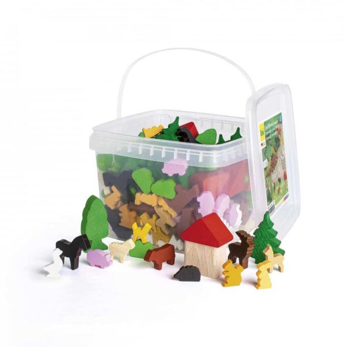 - Inhalt: 200 verschiedene Figuren aus Holz im Kunststoffeimer. 12 Häuser, 6 Dächer, 12 Nadelbäume, 12 Laubbäume, 6 Hirsche, 18 Rehe, 18 Kühe, 12 Pferde, 12 Schweine, 12 Schafe, 6 Katzen, 12 Kaninchen, 18 Gänse, 8 Igel, 6 Eichhörnchen, 30 Büsche