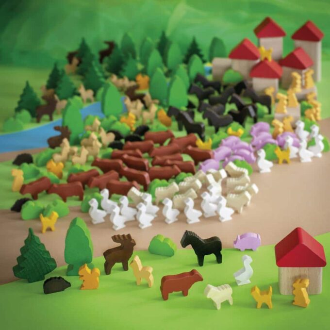 - Inhalt: 200 verschiedene Figuren aus Holz im Kunststoffeimer. 12 Häuser, 6 Dächer, 12 Nadelbäume, 12 Laubbäume, 6 Hirsche, 18 Rehe, 18 Kühe, 12 Pferde, 12 Schweine, 12 Schafe, 6 Katzen, 12 Kaninchen, 18 Gänse, 8 Igel, 6 Eichhörnchen, 30 Büsche