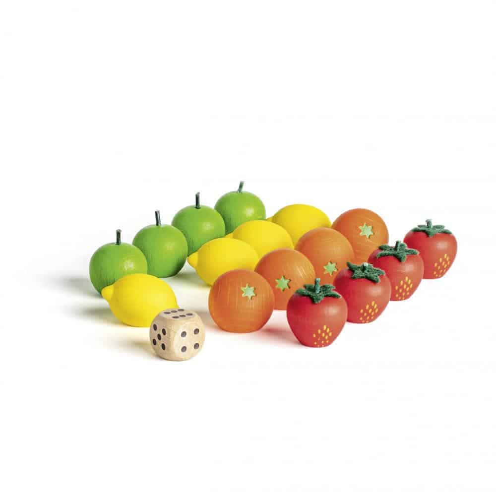 - Inhalt: 1 Spieltisch, 16 Spielfiguren (4x Apfel, 4x Zitrone, 4x Orange, 4x Erdbeere), 1 Würfel
