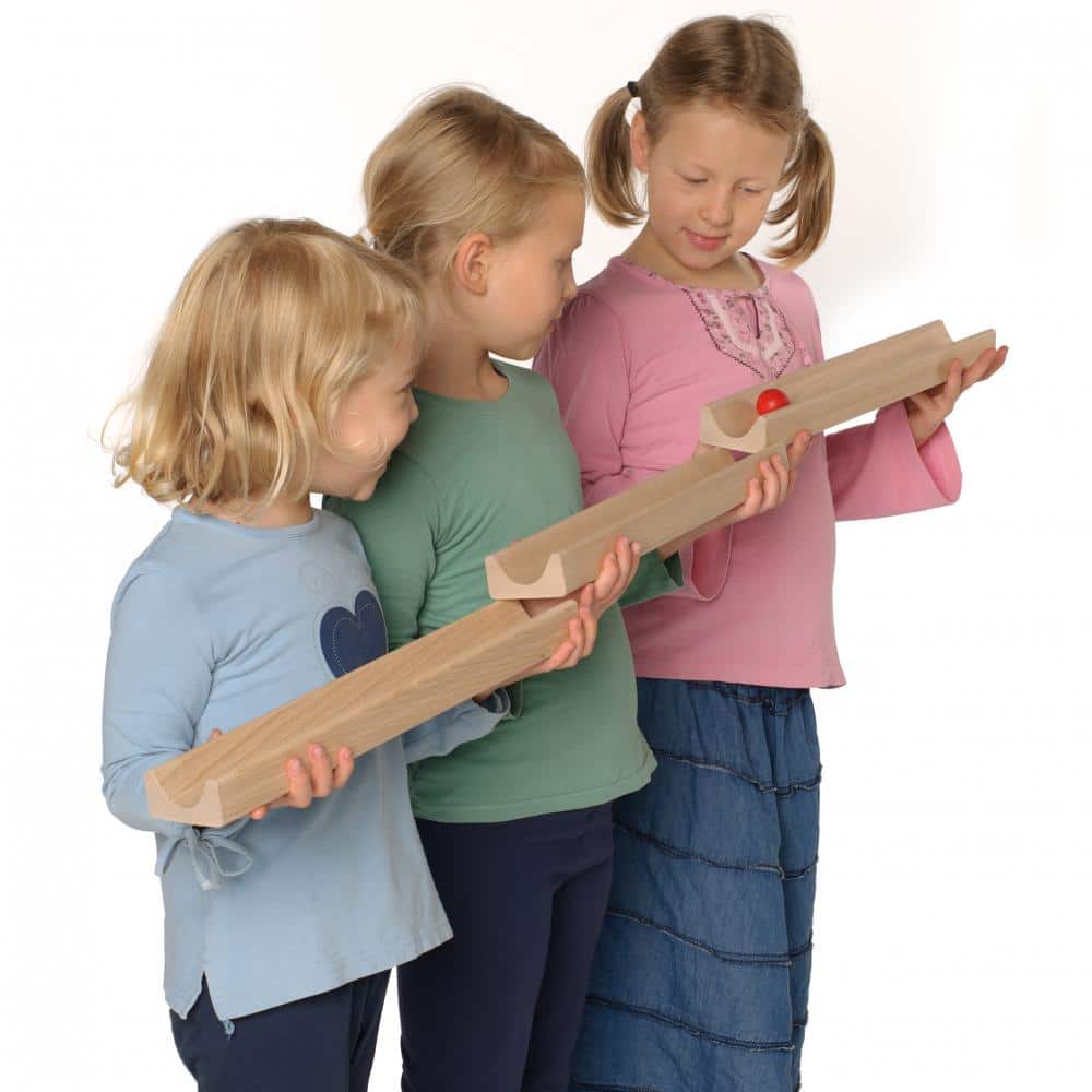 Mit diesen robusten Holzkugelbahnen werden Gruppen zu Teams! Beim gemeinsamen Spiel arbeiten alle Mitspieler Hand in Hand und bauen eine lange Bahn. Ziel ist es, die Holzkugeln ständig in der Rollbewegung zu halten und so nacheinander von einem Punkt zum anderen zu transportieren. Geschicklichkeit, Konzentration, Reaktion und Abstimmung sind hier Pflicht, damit die Kugel nicht auf den Boden fällt. Verschiedene Schwierigkeitsstufen sind durch Reduzierung der Bahnen möglich, ebenso könnten zwei Teams gegeneinander spielen.
