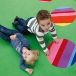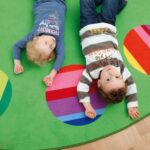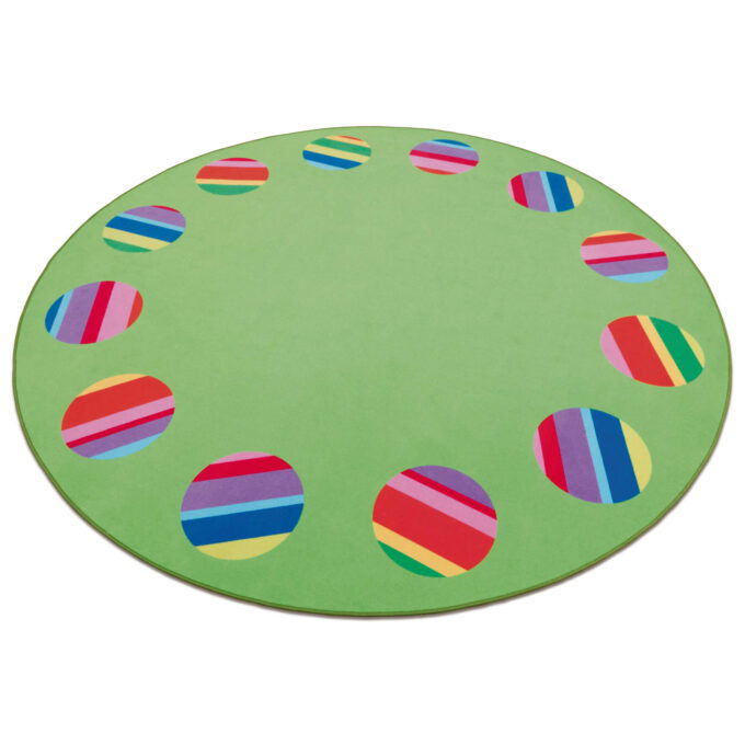 Riesiger, farbenfroher Spielteppich für Morgenkreise, Bewegungsspiele; Hier lassen sich für bis zu 12 Kinder ein Platz in Form eines bunt gestreiften Kreises finden. So kann jeder Tag fröhlich starten. Viele Spielvarianten sind möglich, vom Plumssack bis zum Vorlesen.