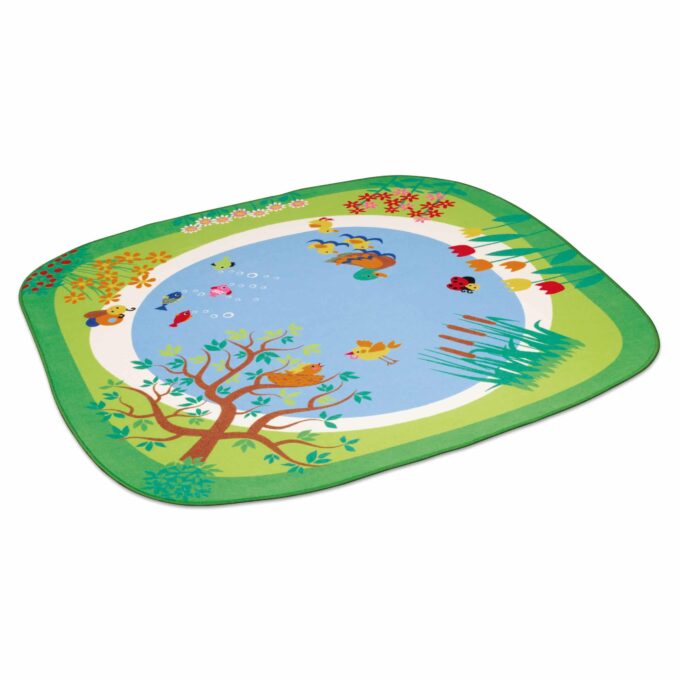 - Thematische Spielwelt: Das detailreiche Motiv mit Wasser, Pflanzen und Tieren dient als perfekte Kulisse. Ob die Entenfamilie einen Ausflug macht, der Frosch von Blatt zu Blatt hüpft oder ein Picknick am Ufer stattfindet – der Teppich inspiriert zu unzähligen Rollenspielen.