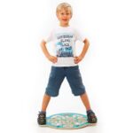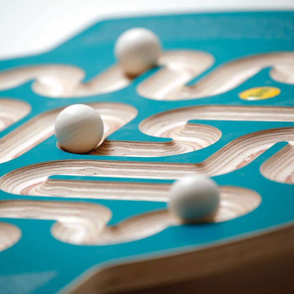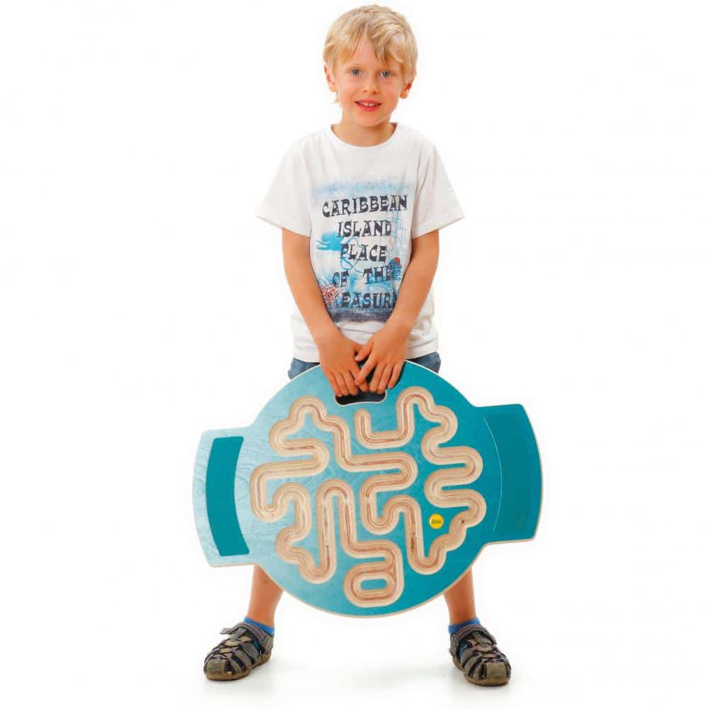 Diese Balancierscheibe sieht komplexer aus als sie tatsächlich ist. Start und Ziel ist am Griffloch. Es gibt nur eine Spur mit einer Wendung. Abkürzen ist verboten! Erzi-Trackboards kombinieren Spiel, Spaß und Bewegung. Ausgestattet mit rutschfesten Trittflächen können Kinder und Erwachsene sich auf diese Balancierscheibe stellen und die Kugeln entlang der Spur ins Ziel bringen. Der flexible und rutschfeste Wippfuß an der Unterseite des Trackboards bietet die entsprechende Sicherheit beim Balancespiel. Der integrierte Tragegriff dient zusätzlich als Kugelhalterung.