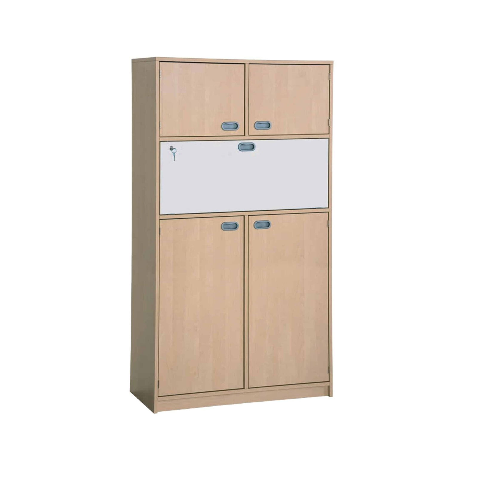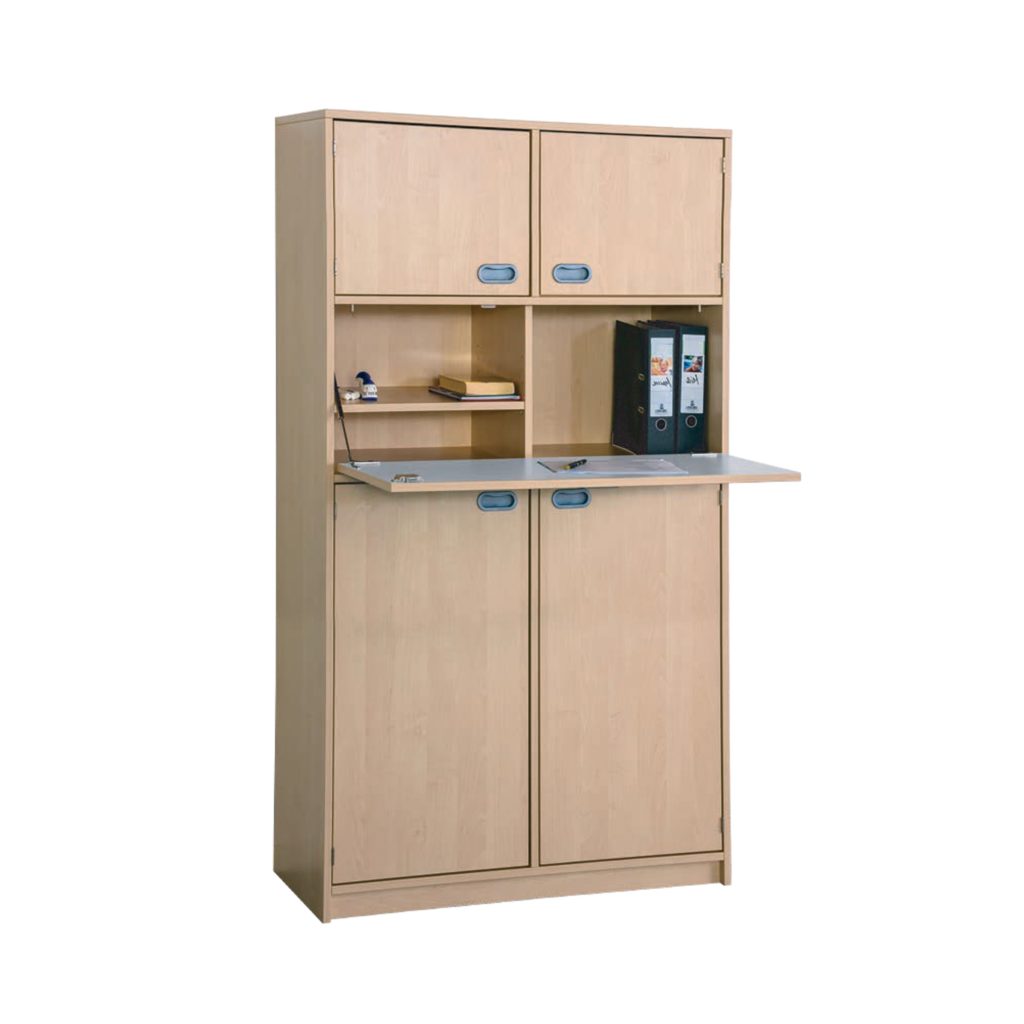 Erzieherarbeitsplatz mit platzsparender, abschließbarer Schreibplatte zum Einklappen. Oben und unten bieten je 2 Türen, oben auf jeder Seite ein Einlegeboden und unten je 2 Einlegeböden, viel Stauraum für Unterlagen. Hinter der Klappe ist rechts 1 Fach in Ordnerhöhe und links ein Boden.