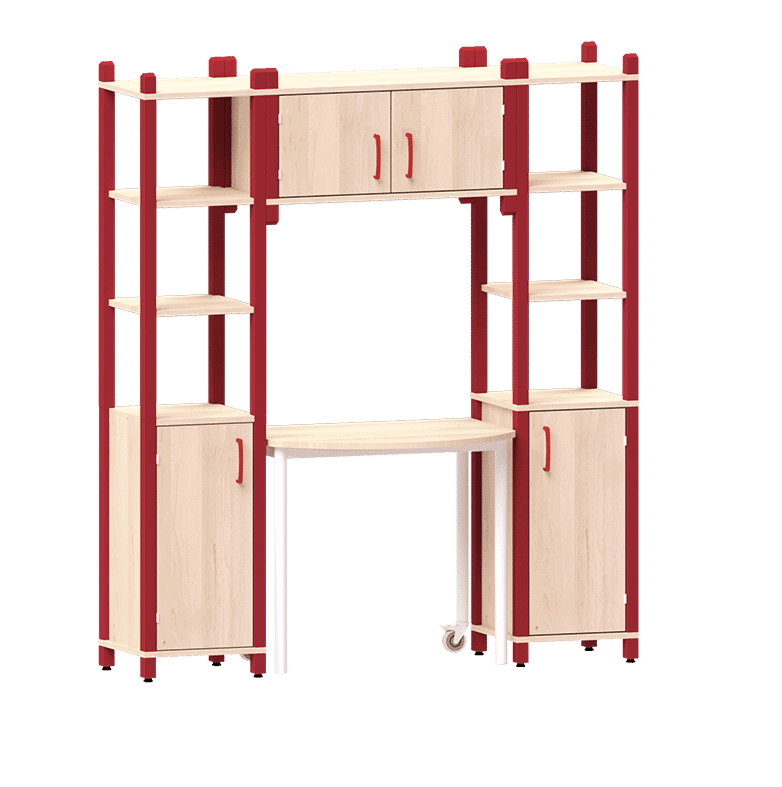 Dieser Erzieher*innenarbeitsplatz wurde speziell für die Bedürfnisse von pädagogischem Personal entwickelt und überzeugt durch eine Kombination von geschlossenen und offenen Fächern zu beiden Seiten. So ist sowohl für übersichtliche Präsentation als auch für geschützte Aufbewahrung von Unterrichtsmaterialien, Spielen und persönlichen Gegenständen gesorgt.