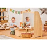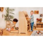 Doch die wahre Magie dieses Regals offenbart sich auf seiner Rückseite: Dort ist ein großer, kindersicherer Acrylspiegel befestigt. Wird das Regal frei im Raum platziert, entsteht eine spannende Zwei-in-Eins-Lösung. Auf der einen Seite herrscht organisierte Ruhe, auf der anderen Seite eröffnet sich eine Welt der Selbstwahrnehmung und des kreativen Spiels. Kinder können Grimassen schneiden, sich beim Anziehen beobachten oder den Spiegel in Rollenspiele integrieren. Dieses Regal ist somit nicht nur ein Aufbewahrungsmöbel, sondern ein aktiver Teil der Lernumgebung.