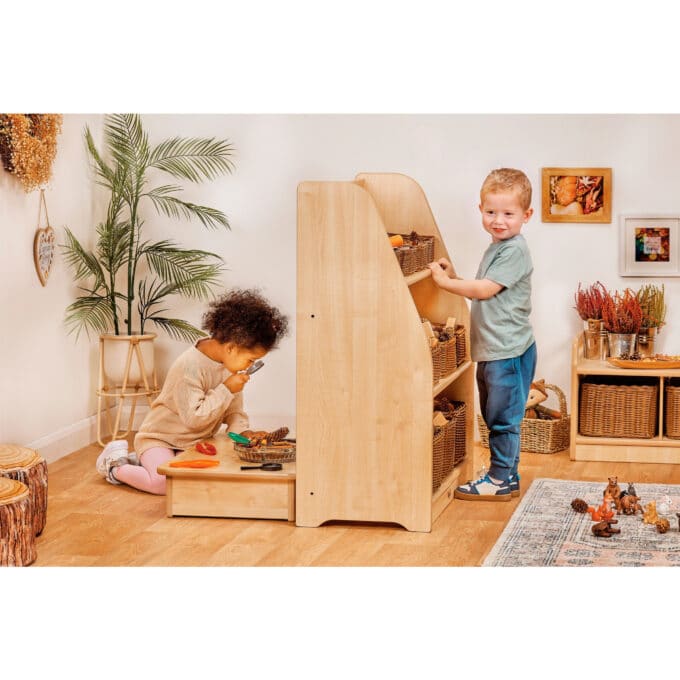 Ein gutes Regal schafft Ordnung. Ein hervorragendes Regal schafft Ordnung, inspiriert zum Spielen und passt sich dem Raum flexibel an. Genau das leistet unser Etagenregal mit Spiegelrückwand. Auf den ersten Blick überzeugt es als klassisches, offenes Möbelstück, das auf drei geräumigen Etagen reichlich Platz für Bücher, Spiele und Bastelmaterialien bietet. Sein klares, neutrales Design fügt sich nahtlos in jede Umgebung ein, von der bunten Kita-Gruppe bis zum heimischen Spielzimmer.