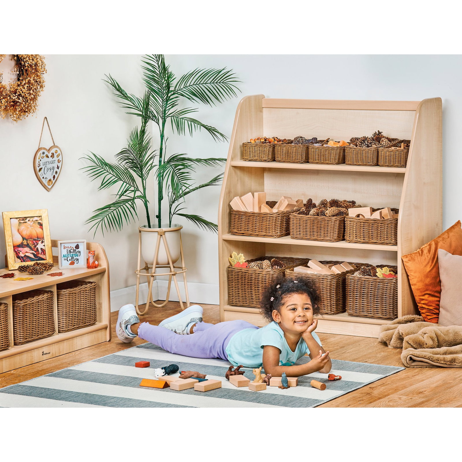 - Ordnung und Stauraum: Drei breite Fächer bieten großzügigen Platz, um Materialien übersichtlich zu sortieren. Ob mit den optional erhältlichen Rattankörben für Kleinteile oder offen für große Bilderbücher – alles findet seinen Platz.