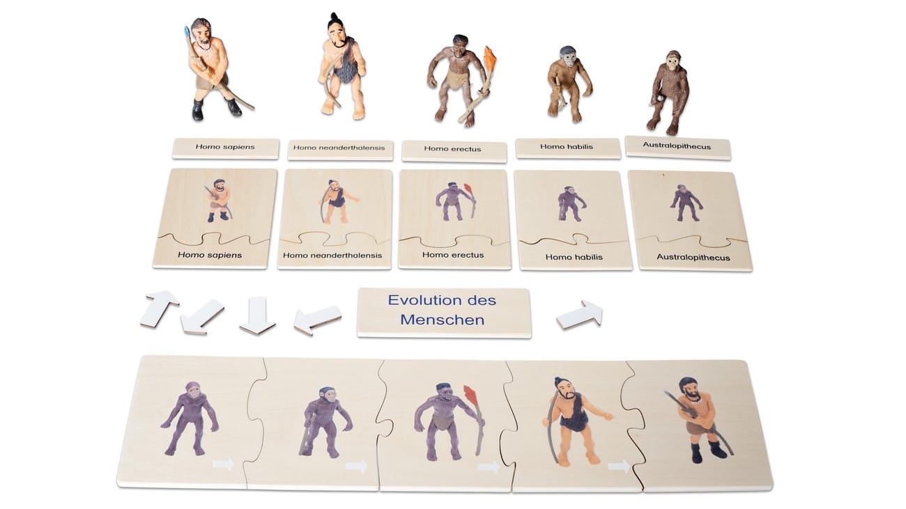 Das Set beinhaltet 5 detailreich gestaltete Figuren der menschlichen Evolution, die Ihre Kinder nicht nur zuordnen, sondern auch mit den entsprechenden Namensschildchen versehen können. Die Puzzles unterstützen die visuelle Lernerfahrung und fördern die Konzentration, Geduld und Problemlösefähigkeiten Ihrer Schülerinnen und Schüler, während sie die verschiedenen Phasen der menschlichen Evolution in die richtige Reihenfolge bringen.