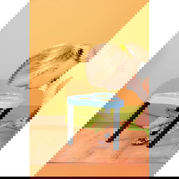 Rundherum gucken … Die Explorer Box hat eine Lupe im Deckel und eine Bewegliche Lupe mit LED-Licht – durch den Kugelkopf ist sie beweglich, so dass die Kinder das interessante Objekt im Gehäuse direkt „ansteuern“ können. Der Deckel hat Luftschlitze und einen Tragegriff.