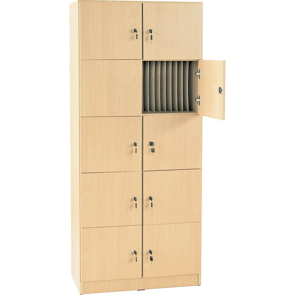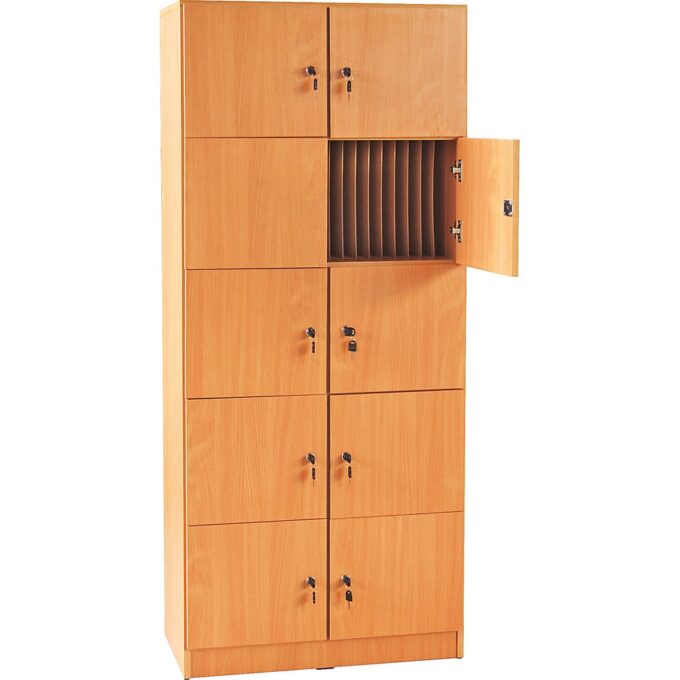 - 8 abschließbare Fächer und 1 breites Fach für Klassenbücher