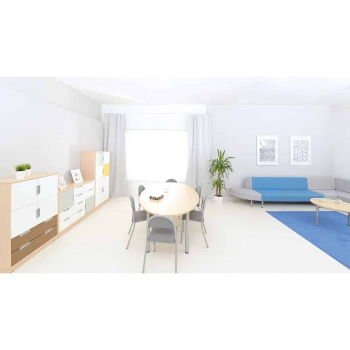 Der EXPO Konferenztisch überzeugt durch ein robustes, alufarbenes Metallgestell und höhenjustierbare Tischbeine, die bis zu 25 mm verstellbar sind und kleine Bodenunebenheiten mühelos ausgleichen. Die ovale Tischplatte besteht aus 25 mm starker laminierter Spanplatte mit 2 mm starken ABS-Kanten und ist in den Dekoren Weiß, Ahorn oder Buche erhältlich. Diese vielseitigen Optionen ermöglichen es, den Tisch optimal an Ihre bestehende Büroeinrichtung anzupassen.