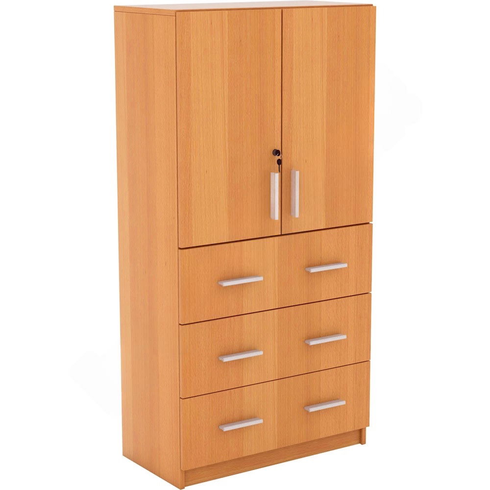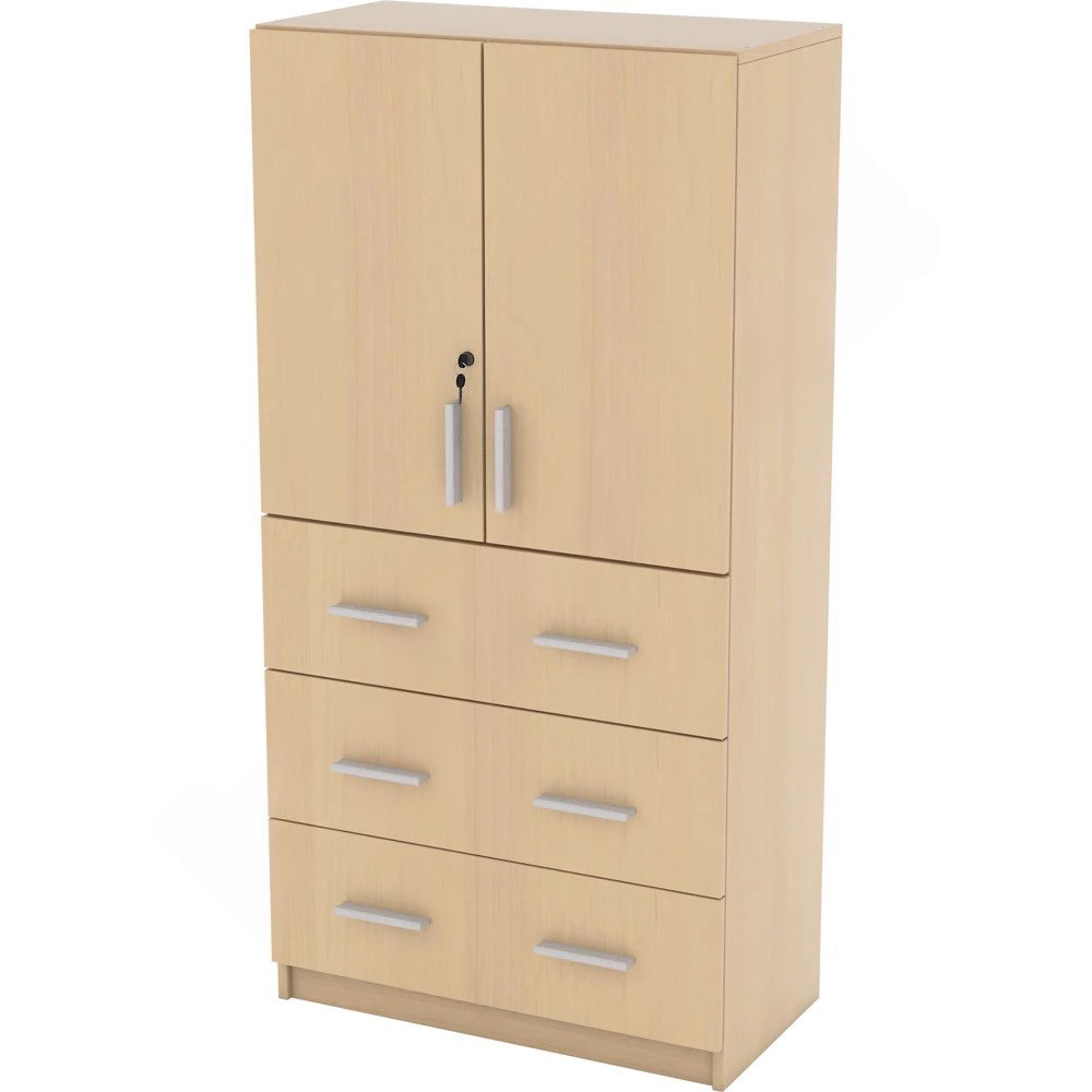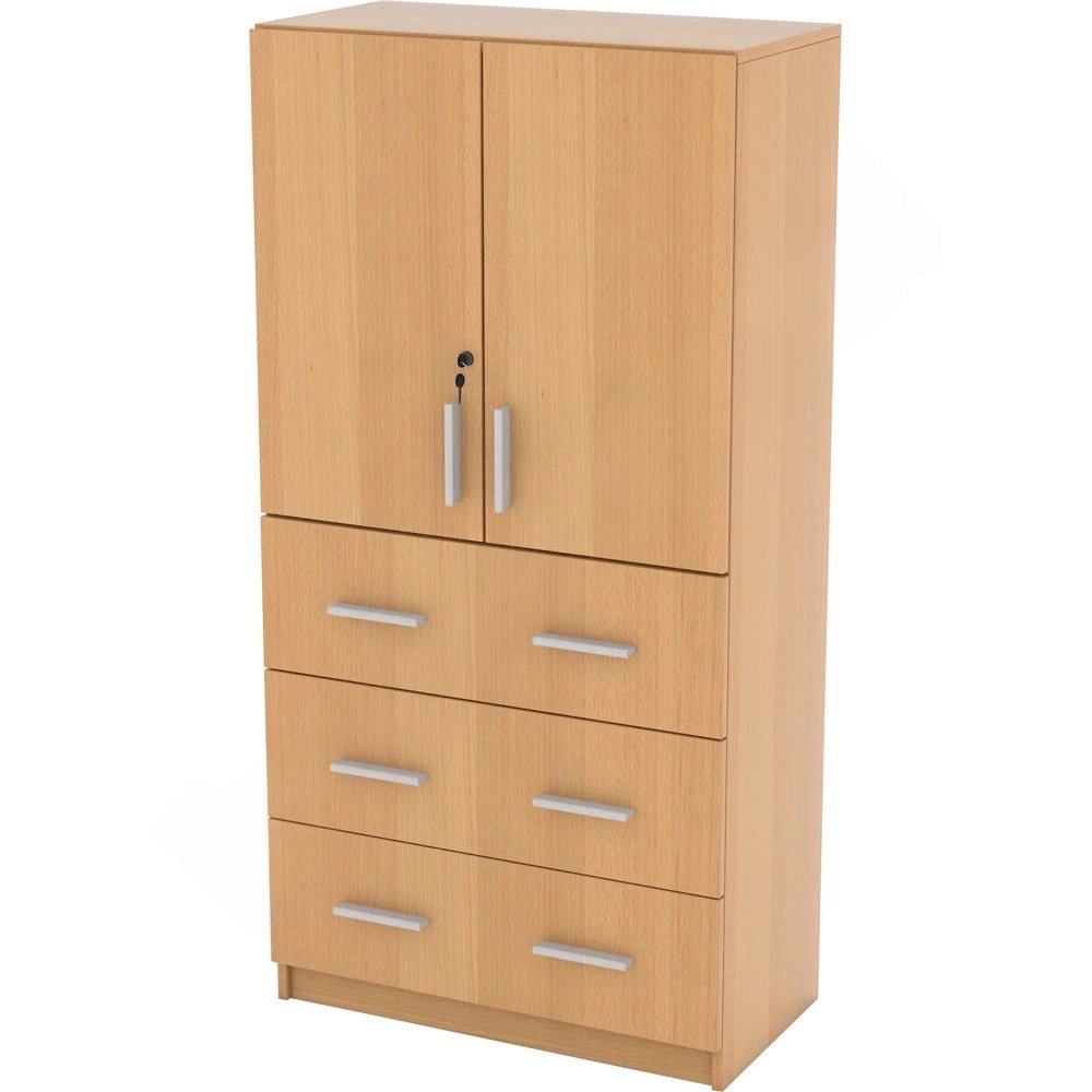Das Design besticht durch seine klare Gliederung: Im unteren Bereich sorgen drei geräumige Schubladen für schnellen Zugriff auf Büromaterialien, während der obere Schrankteil hinter abschließbaren Türen Platz für Ordner und Dokumente bietet. Erhältlich in den freundlichen Dekoren Ahorn und Buche, fügt sich der Schrank harmonisch in jede professionelle Umgebung ein. Er strahlt Ruhe und Struktur aus und hilft Ihnen dabei, auch auf begrenztem Raum maximale Ordnung zu halten.