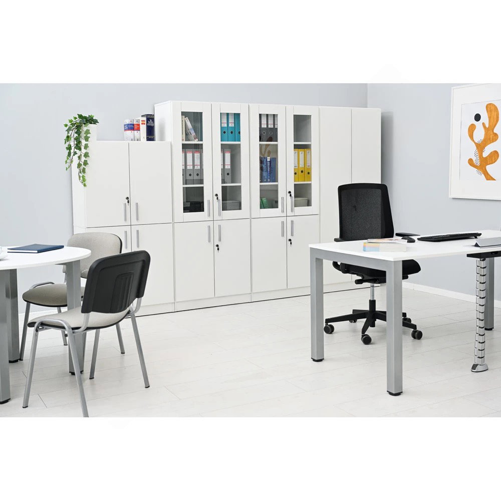 Im Gegensatz zu Kombi-Regalen bietet dieses Modell durchgehenden Schutz. Alle Ihre Unterlagen, von der ersten bis zur vierten Ordnerhöhe, sind sicher hinter verschlossenen Türen aufbewahrt. Das sorgt für maximale Diskretion und schützt vor Staub und unbefugtem Zugriff. - Hohe Flexibilität durch verstellbare Böden