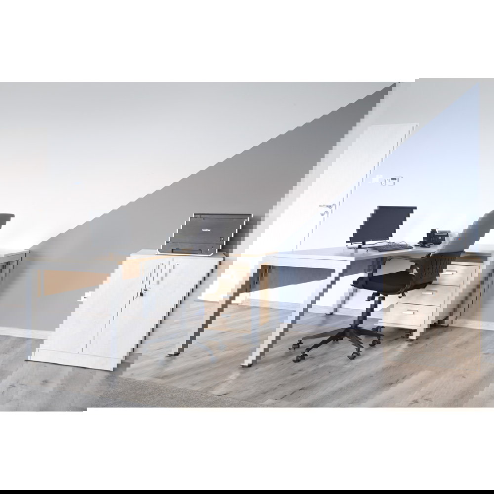Hinter den Türen verbirgt sich ein geräumiger Innenraum, der mit einem Einlegeboden ausgestattet ist. Dieser Boden lässt sich in der Höhe verstellen, sodass Sie den Stauraum exakt an Ihre Bedürfnisse anpassen können. Lagern Sie mehrere Stapel A4-Papier, große Toner-Boxen oder andere Utensilien genau so, wie es für Sie am praktischsten ist. - Optimale Arbeitshöhe und kompakte Maße