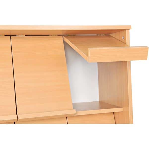 Unten Schrankteil, oben Ablagen zur Ausstellung von Zeitschriften. Hinter den Klappfächern lassen sich die entsprechenden Zeitschriften lagern.
