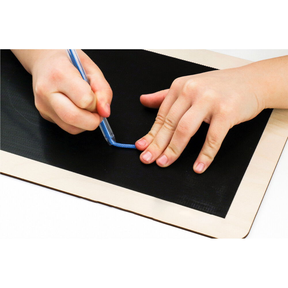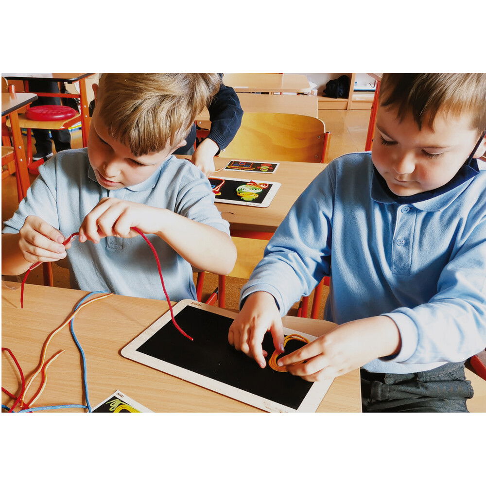 Um die Schnüre im Board zu fixieren, ist ein gewisser Druck nötig. Kinder lernen dabei intuitiv, wie viel Kraft sie aufwenden müssen, was ihnen hilft, ihren Fingerdruck besser zu regulieren – eine wichtige Fähigkeit für viele alltägliche Handgriffe. - Anregung von Kreativität und Fantasie