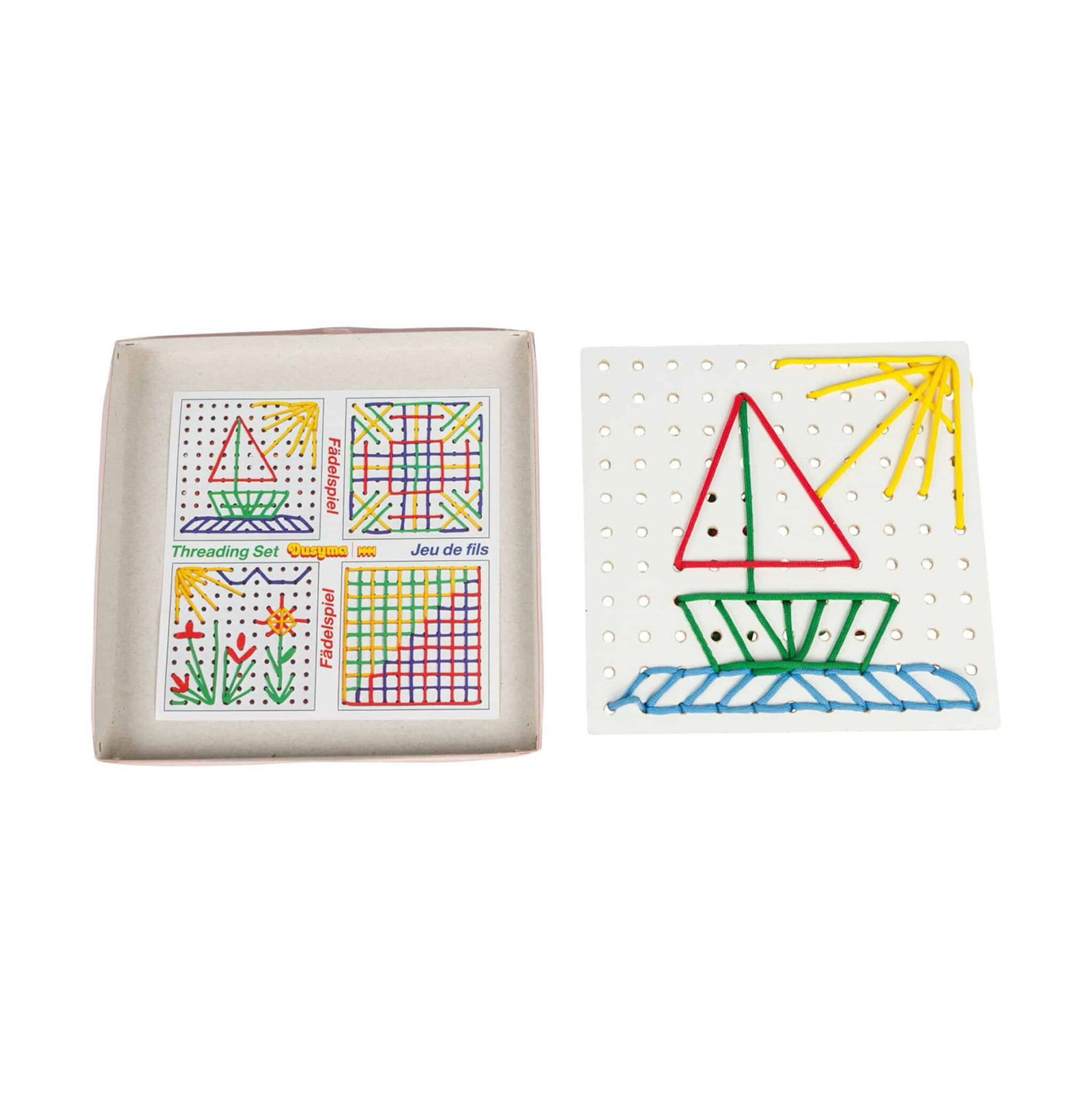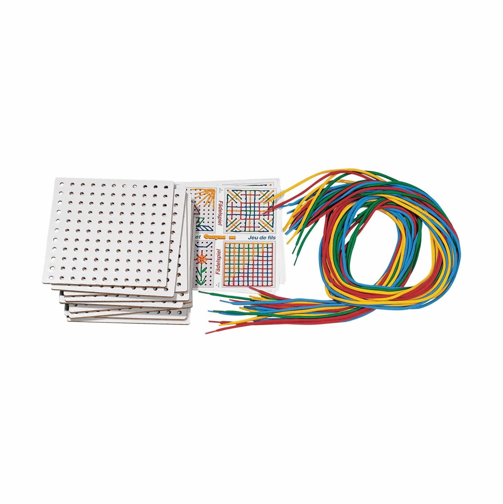 - Inhalt: 10 Lochplatten (17,5 x 17,5 cm, aus Hartfaserplatte), 40 Fädelschnüre (in 4 Farben sortiert), inklusive Vorlagenblätter.
