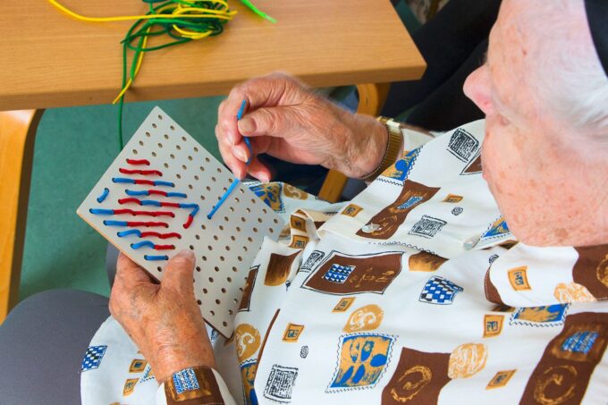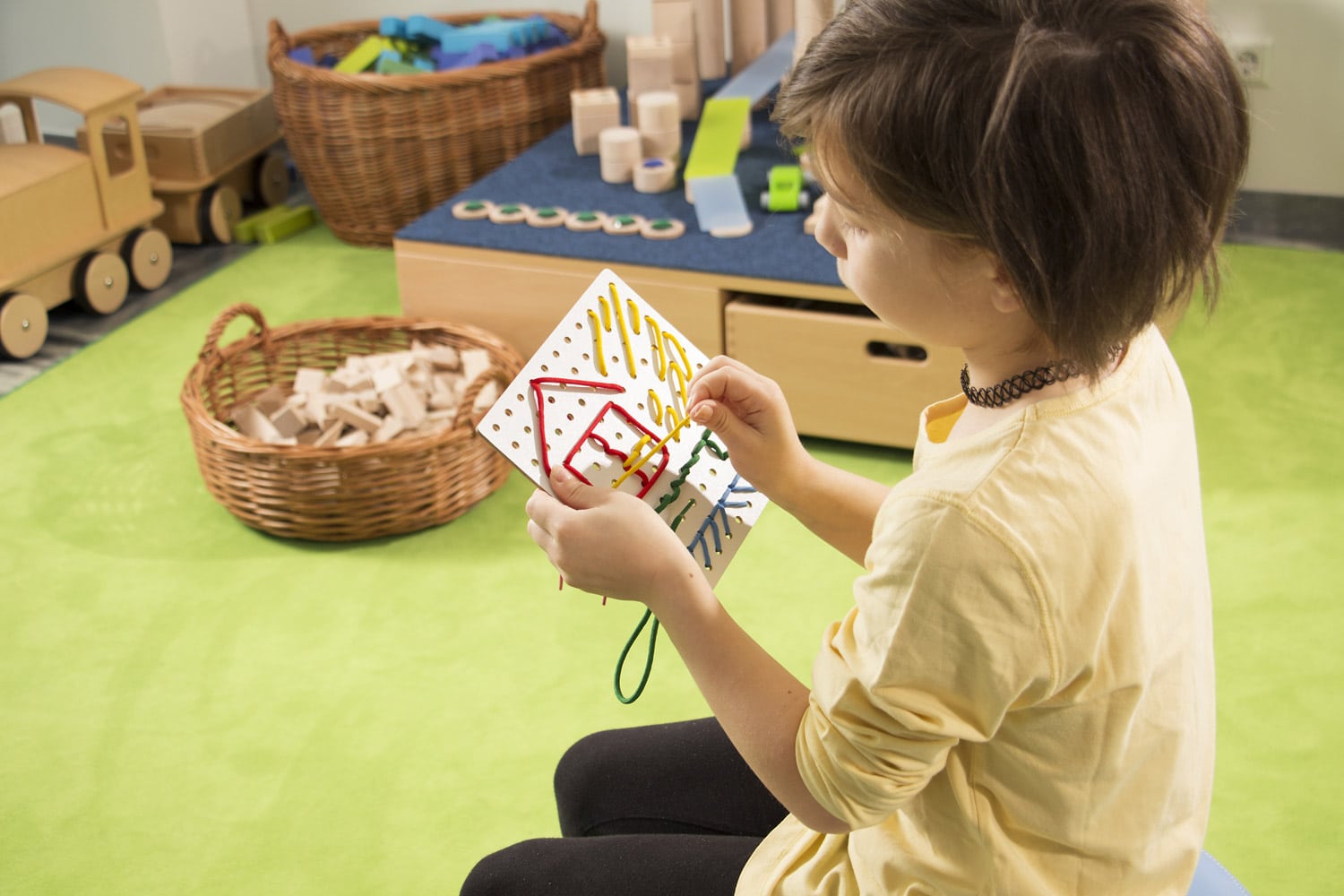 - Kleine Öffnungen, große Wirkung: Die Fädelarbeit trainiert das präzise Platzieren und Fördern der Fingerfertigkeit.