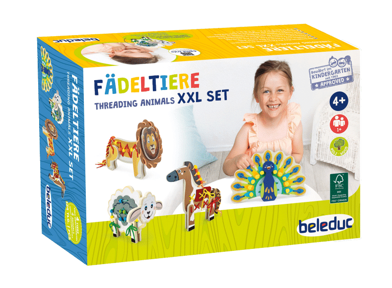 Die Fädeltiere ermöglichen es den Kindern, die Tiere immer wieder neu zu gestalten und mit verschiedenen Farben zu experimentieren. Mit 19 Holzelementen für 4 Tiere, 14 Schnüren in 6 Farben, 26 Filzelementen und 70 Holzperlen in 4 Farben sind der Fantasie keine Grenzen gesetzt. Die Kinder können die Tiere nach Lust und Laune fädeln und gestalten, wobei sie spielerisch die Vorstellung von Mengenverhältnissen, Symmetrie und Reihenbildung erlernen.