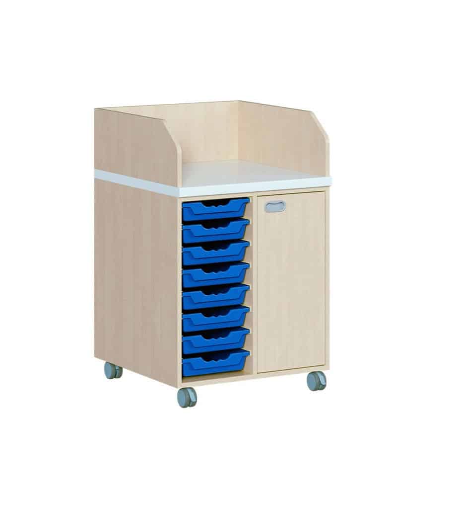 Besonders in engen Räumlichkeiten schaffen die fahrbaren Wickelkommoden ausreichend Flexibilität. Bei einer Breite von 70,5 cm gliedert sie sich optimal an jede Stelle des Raumes ein. Unterhalb des Wickeltisches befindet sich ein Regal, welches durch eine Tür diskret verschließbar ist sowie auf der anderen Seite 8 ErgoTrayboxen, wodurch ausreichend Stauraum für Wickelzubehör gewährleistet wird. Die Kommode ist mit einer Tiefe von 71 oder 91 cm bestellbar. Außerdem kann die Ausrichtung der verschlossenen Türseite (links oder rechts) bei der Bestellung beliebig konfiguriert werden.