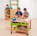 - Praktische Aufbewahrung: Die Spielmaterialien können griffbereit in passenden Materialkästen (separat zu bestellen) und im großen Ablagefach untergebracht werden.