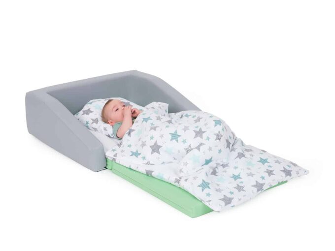 Ein besonderes Merkmal dieser Liege sind die erhöhten Seitenteile im Kopfbereich. Wenn das Bett aufgeklappt ist, bilden diese eine sanfte Barriere zur Außenwelt. Dies schirmt das Kind optisch und akustisch etwas ab, vermittelt ein Gefühl von Schutz und fördert so einen ruhigen, ungestörten Schlaf – selbst in belebteren Räumen. - Blitzschneller Umbau