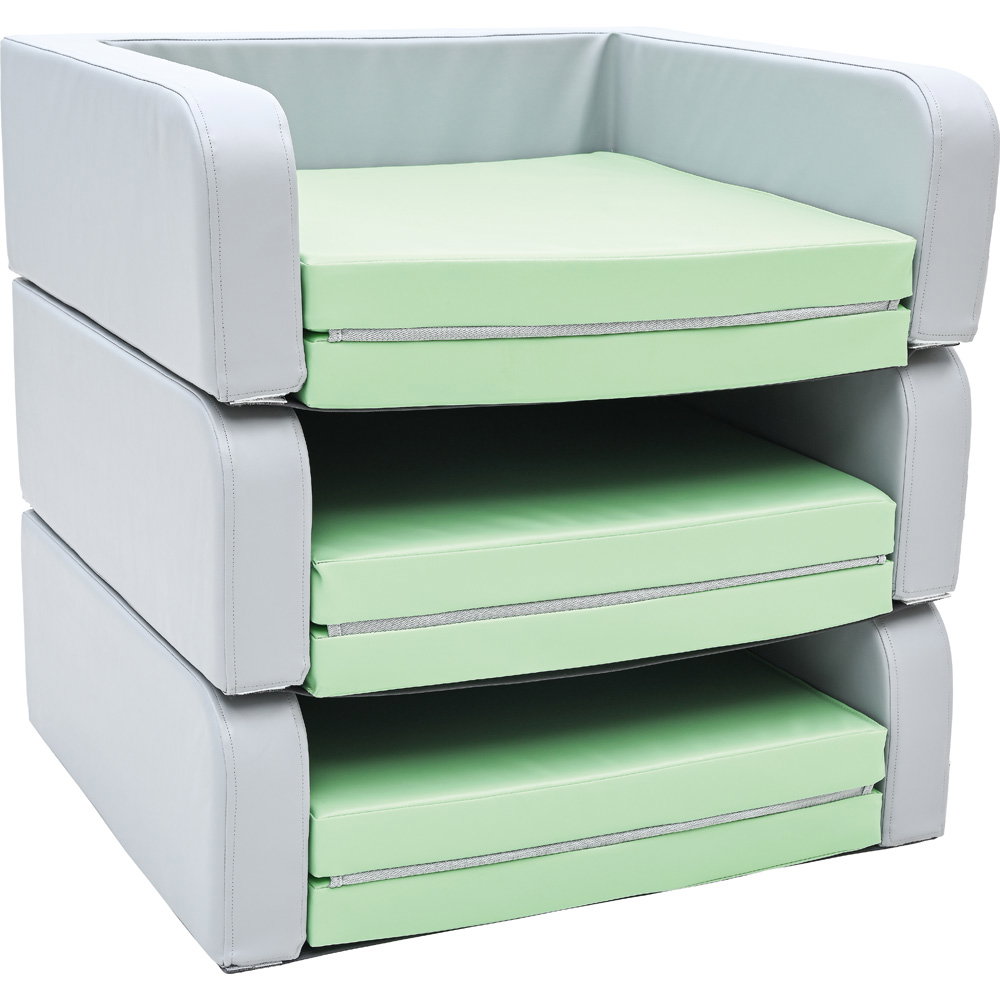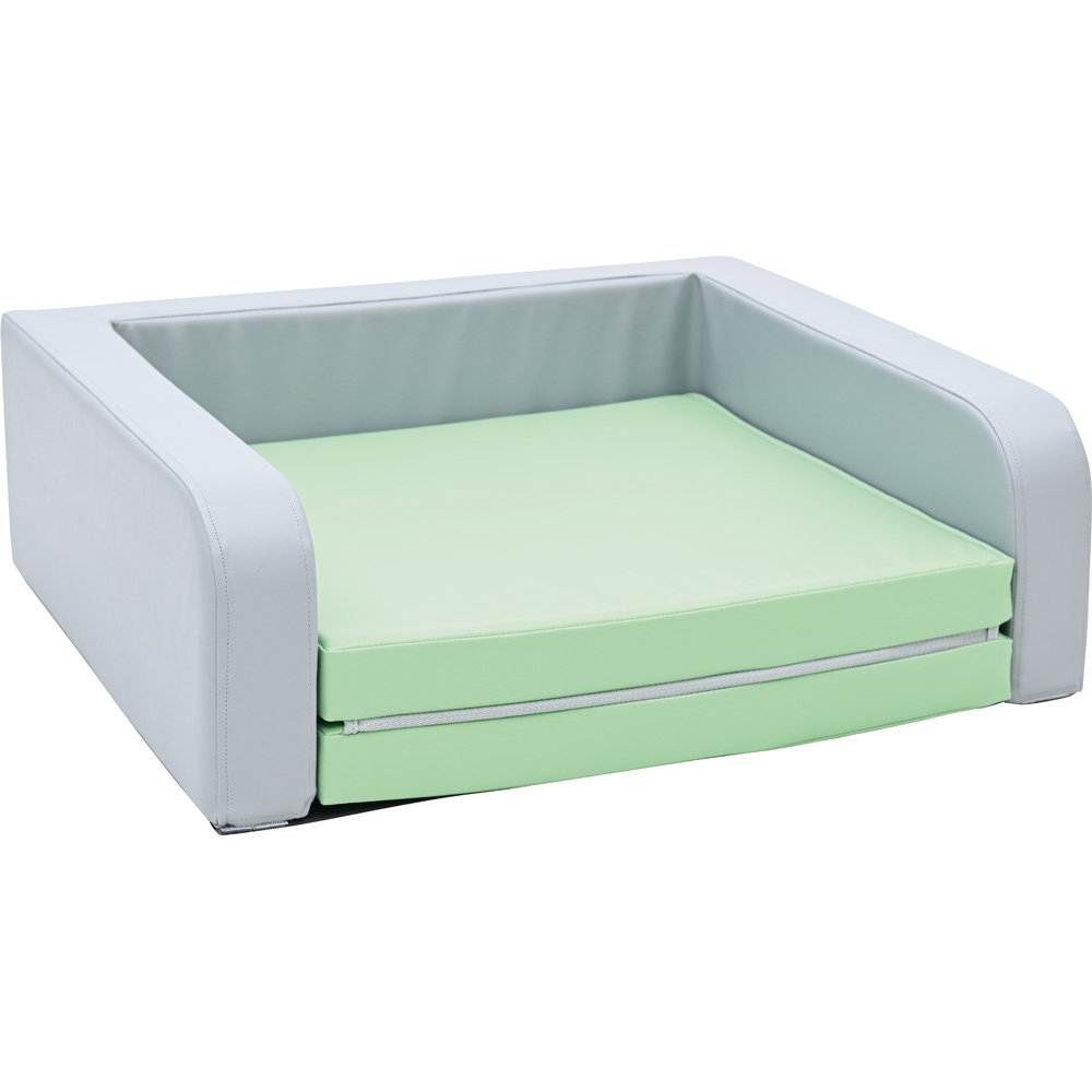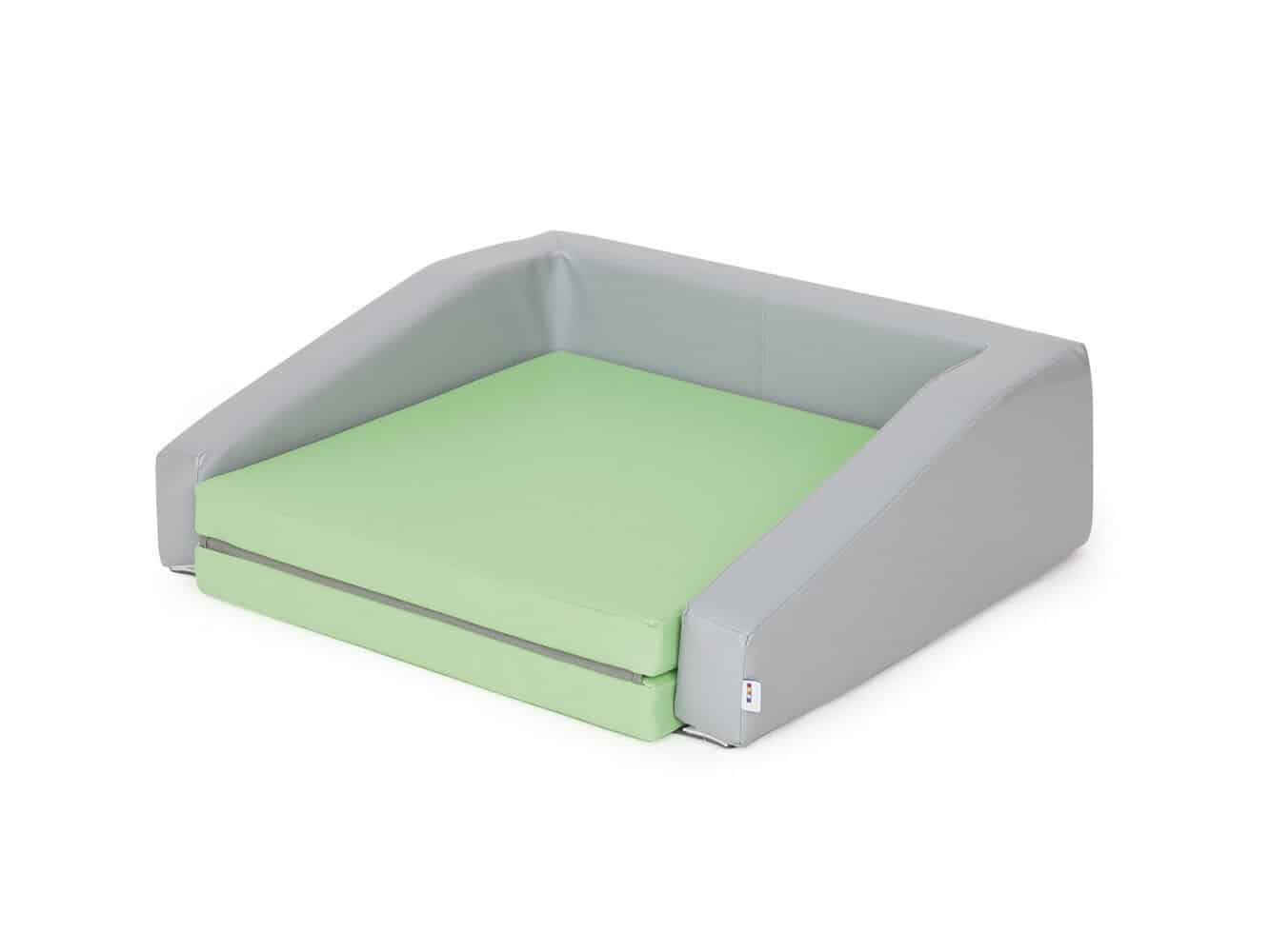 Dieses innovative Möbelstück ist mehr als nur eine Matratze. Es ist ein durchdachter Rückzugsort, der Kindern Geborgenheit schenkt. Im zusammengeklappten Zustand dient es als bequeme Sitzgelegenheit oder kompaktes Polster. Wird es Zeit für den Mittagsschlaf oder eine kurze Auszeit, entfaltet sich die Liege mit einem Handgriff zu einem vollwertigen Schlafplatz. Das dezente Design in Grau und Grün fügt sich harmonisch in moderne Raumkonzepte ein und schafft eine beruhigende Atmosphäre.