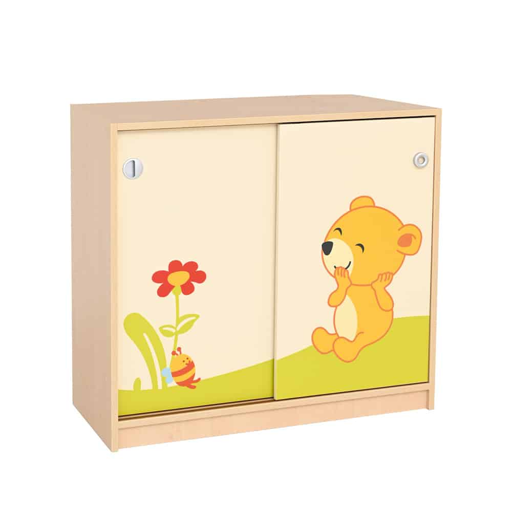 Verzaubern Sie Ihre Gruppenräume mit dem herzlichen Fantasiewelt Schrank mit Bärchen auf Wiese. Diese liebevoll gestaltete Möbelkollektion schafft eine warme Atmosphäre und bietet gleichzeitig praktischen Raum zur Aufbewahrung von Lern- und Spielmaterialien.