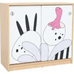- Design: Schrankfronten aus laminierter MDF-Platte (16 mm) mit niedlichen Dino-Baby-Bildern, Korpus in Birke Dekor (18 mm)