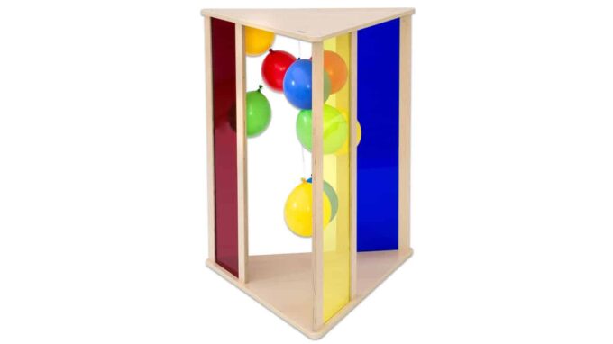 Das Farbdreieck besteht aus drei Seiten, die jeweils mit einer Acrylglasscheibe in einer Primärfarbe ausgestattet sind. Diese speziell konstruierten Eingänge erlauben es den Kindern, ins Innere des Dreiecks zu gelangen. Bei Lichteinstrahlung brechen die Farben und vermischen sich, was ein wunderschönes Farbenspiel ergibt. Die Kinder können sich im Dreieck setzen, hindurchlaufen oder sich einfach auf den Boden legen, während sie die Farben beobachten und ihre Sinne erleben.