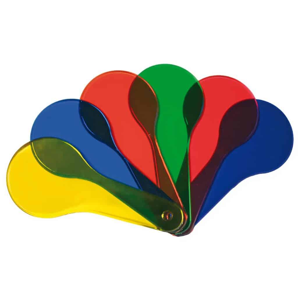 - Bestandteile: 6 transparente, farbige Paddel, die an einer Niete zu einem Fächer verbunden sind.
