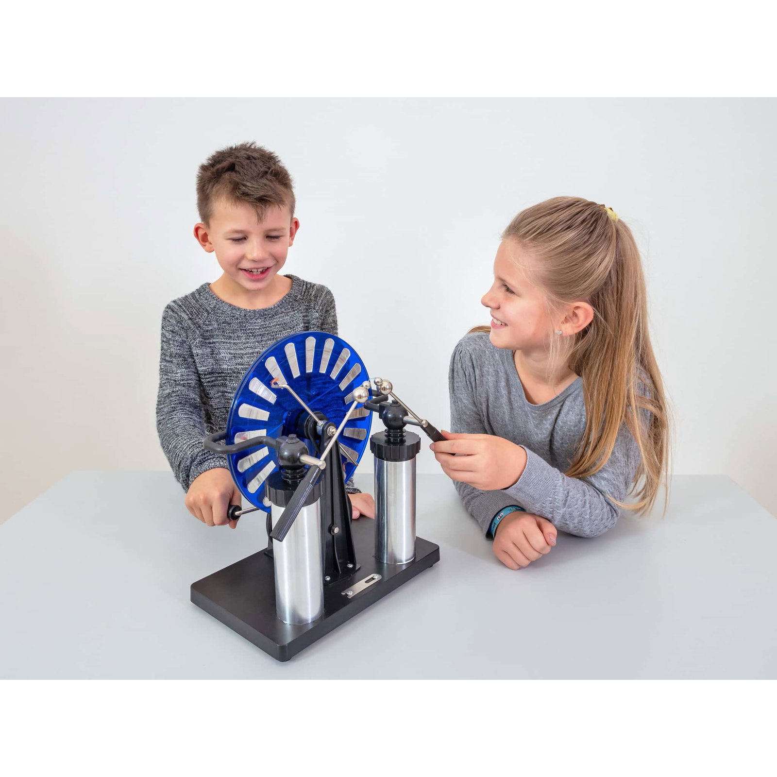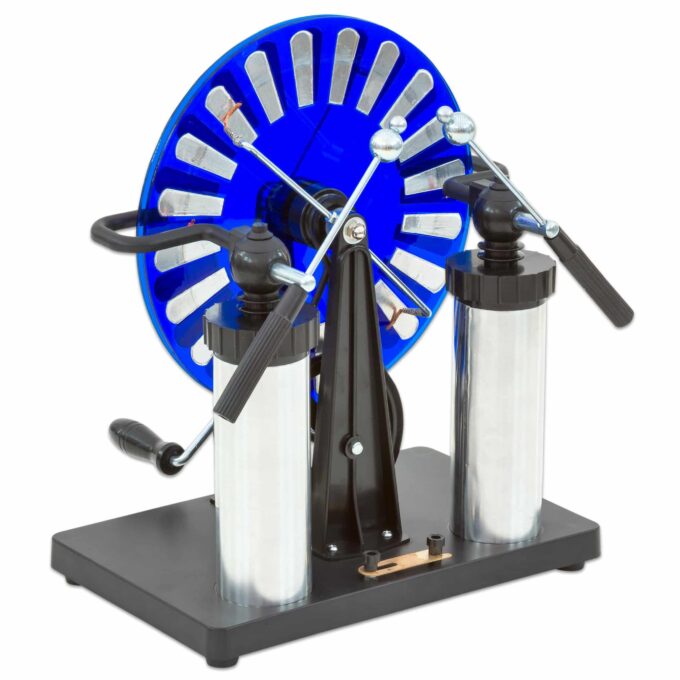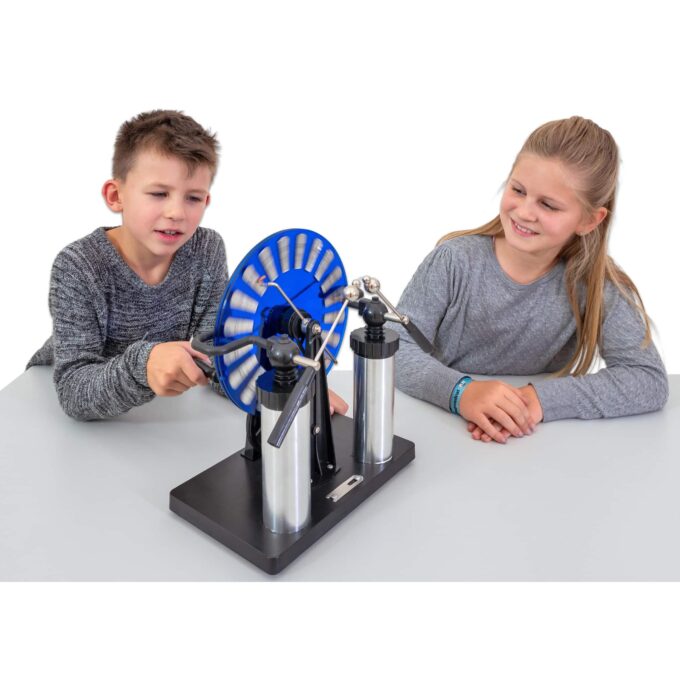 Das Beobachten der knallenden Funkenüberschläge bietet den Schülern nicht nur eine spektakuläre Show, sondern ermöglicht es ihnen auch, zu verstehen, wie Elektrizität funktioniert. Die statische Aufladung, die beim Drehen der Plexiglasscheiben entsteht, macht das Phänomen sichtbar und fesselt die Aufmerksamkeit Ihrer Klasse.