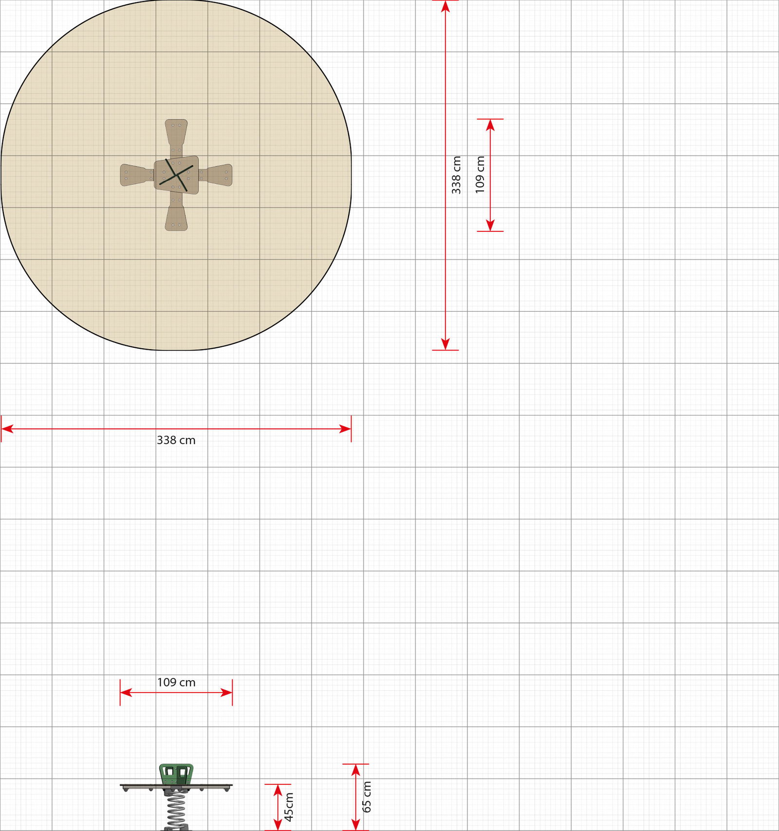 - Platzbedarf inkl. Sicherheitsabstände (LxB): 338 x 338 cm