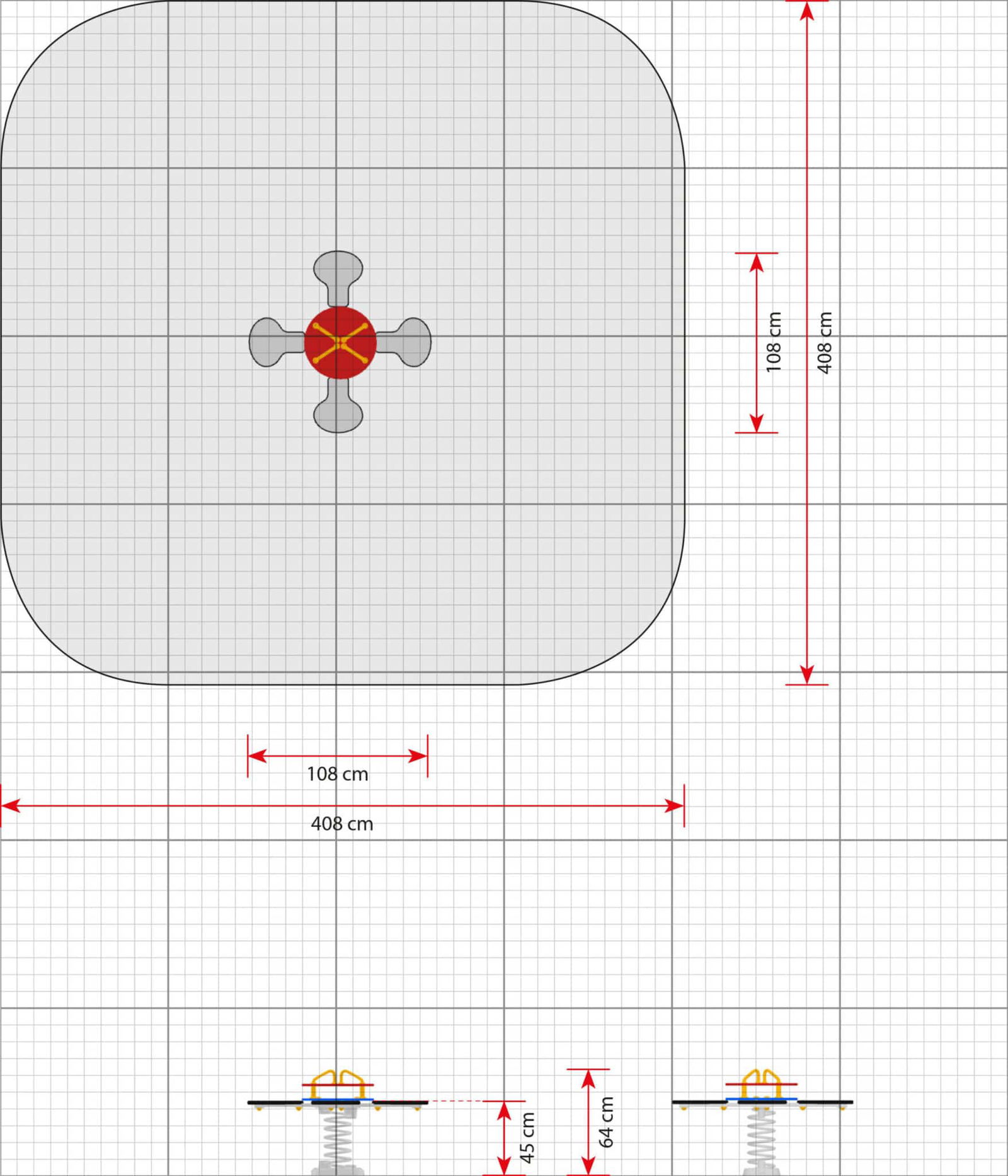 - Platzbedarf inkl. Sicherheitsabstände (LxB): 408 x 408 cm
