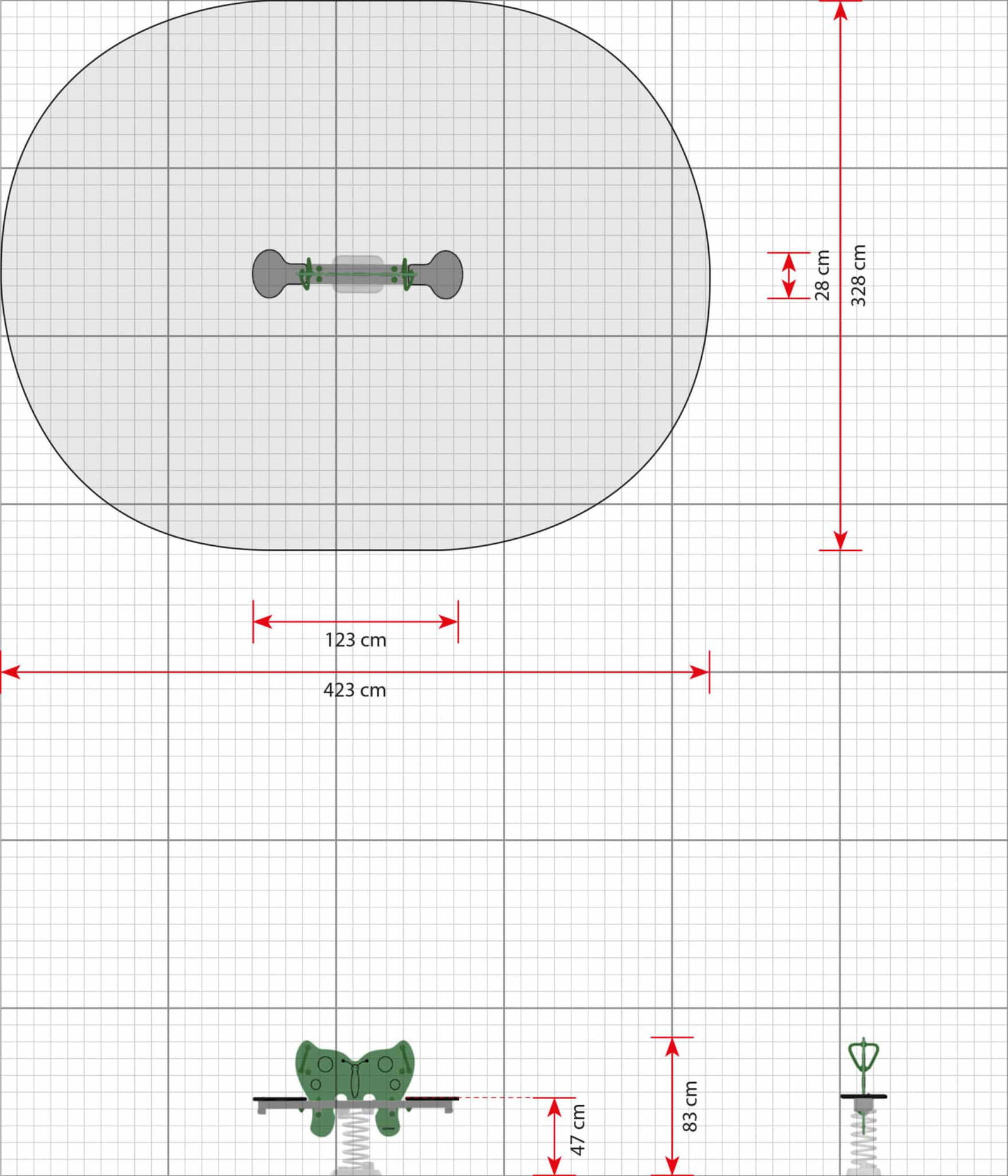 - Platzbedarf inkl. Sicherheitsabstände (LxB): 423 x 328 cm