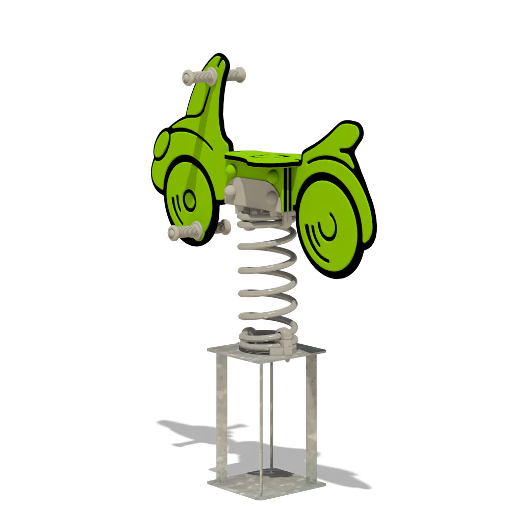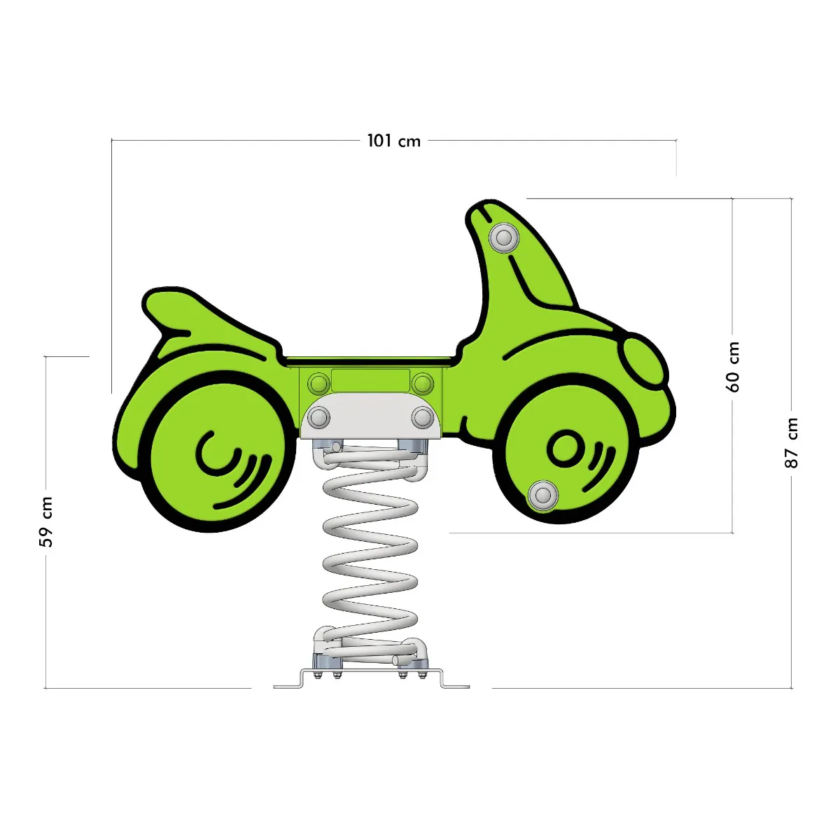 Dank der verstärkten Kunststoffhandgriffe und Fußstützen mit Anti-Rutsch-Profil haben die kleinen Fahrer jederzeit einen sicheren Halt. Die Feder aus pulverbeschichtetem Stahl sorgt für ein sanftes Wipperlebnis, während die feuerverzinkte Stahlverankerung eine einfache und sichere Installation durch Einbetonieren oder Verschrauben ermöglicht. So bleibt „Buggey“ stabil und sicher, egal wie wild das Rennen wird!