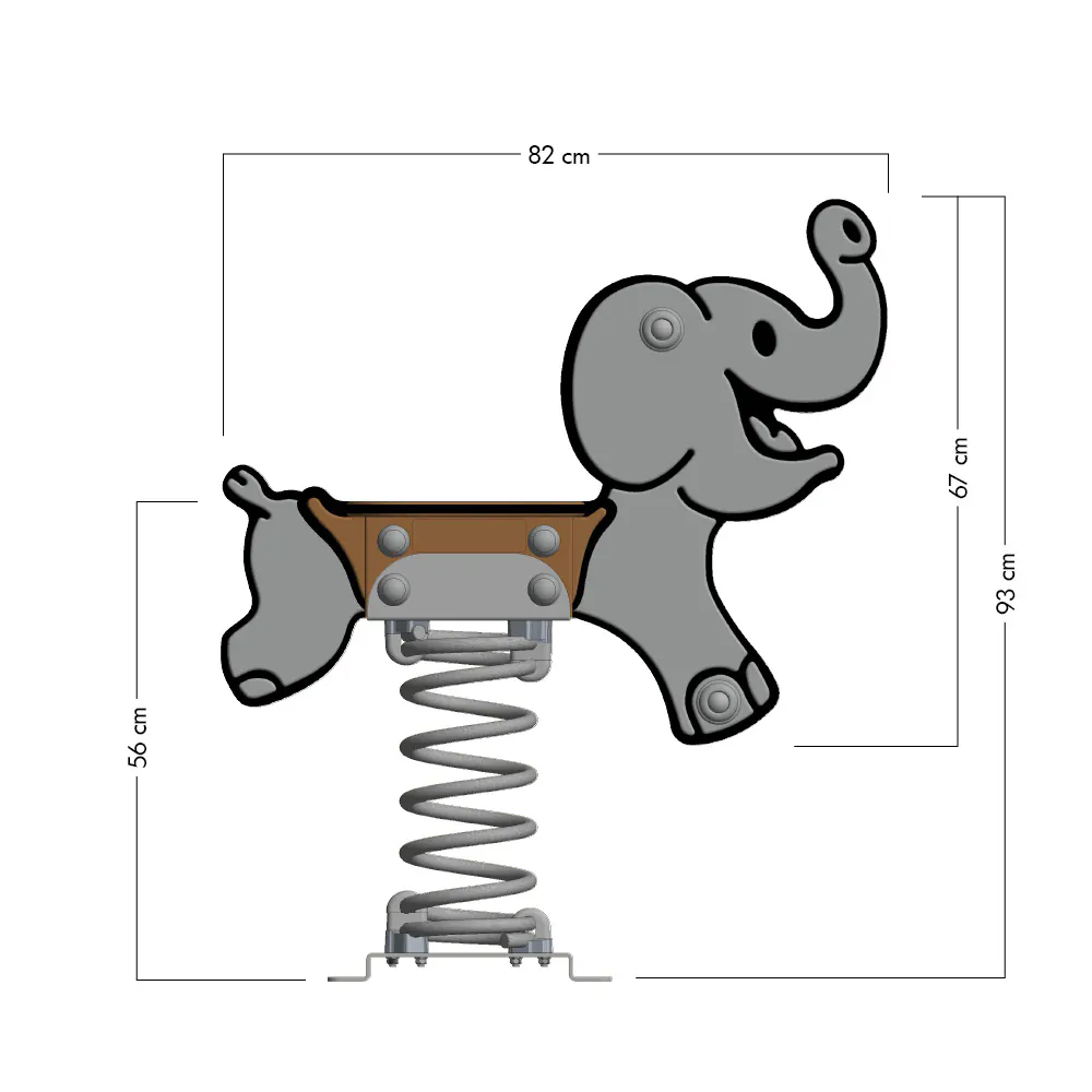 Zudem gewährleisten die verstärkten Kunststoffhandgriffe und Fußstützen mit Anti-Rutsch-Profil, dass die kleinen Elefanten während des Spiels stets einen sicheren Halt haben. Die Feder aus pulverbeschichtetem Stahl sorgt für ein sanftes und kontrolliertes Wippen und wird mit einer feuerverzinkten Stahlverankerung geliefert, um eine einfache Montage durch Einbetonieren oder Verschrauben zu ermöglichen. So bleibt „Clumsey“ stabil und sicher, auch bei stürmischem Spielvergnügen.