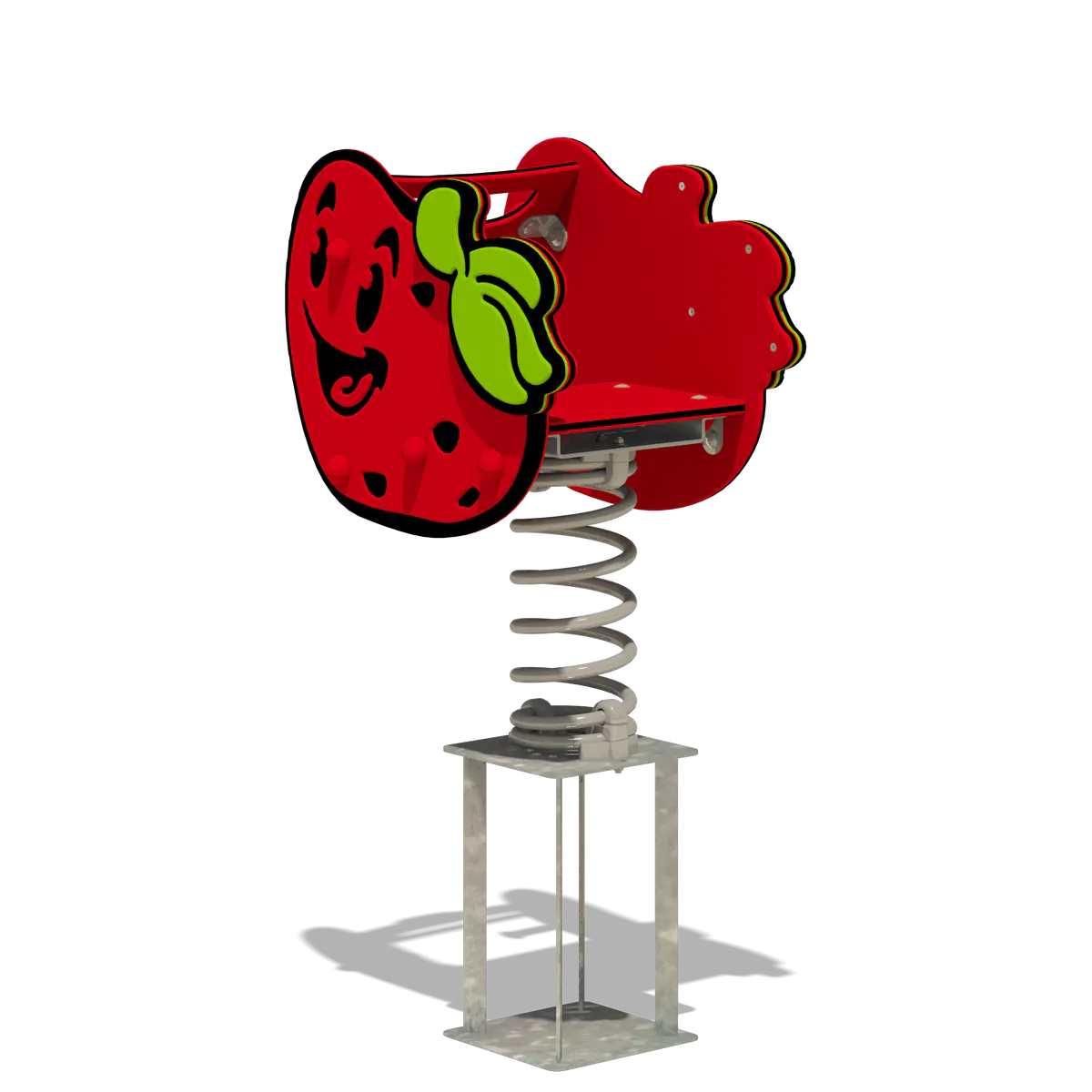 Die verstärkten Kunststoffhandgriffe und Fußstützen mit Anti-Rutsch-Profil garantieren den kleinen Erdbeeren sicheren Halt während des Spiels. Die Feder aus pulverbeschichtetem Stahl sorgt für ein sanftes und kontrolliertes Wippen und ist mit einer feuerverzinkten Stahlverankerung ausgestattet. Diese ermöglicht eine einfache Montage durch Einbetonieren oder Verschrauben, wodurch „Juicey“ stabil und sicher bleibt.