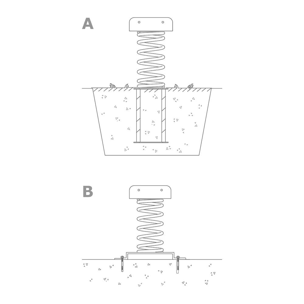 Die verstärkten Kunststoffhandgriffe und Fußstützen mit Anti-Rutsch-Profil geben den kleinen Fahrern den Halt, den sie beim Spielen benötigen, während die Feder aus pulverbeschichtetem Stahl für ein sanftes Wipperlebnis sorgt. Die feuerverzinkte Stahlverankerung ermöglicht eine einfache Montage durch Einbetonieren oder Verschrauben, sodass die Wippe stabil bleibt, selbst bei wildem Spiel.