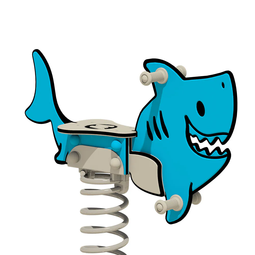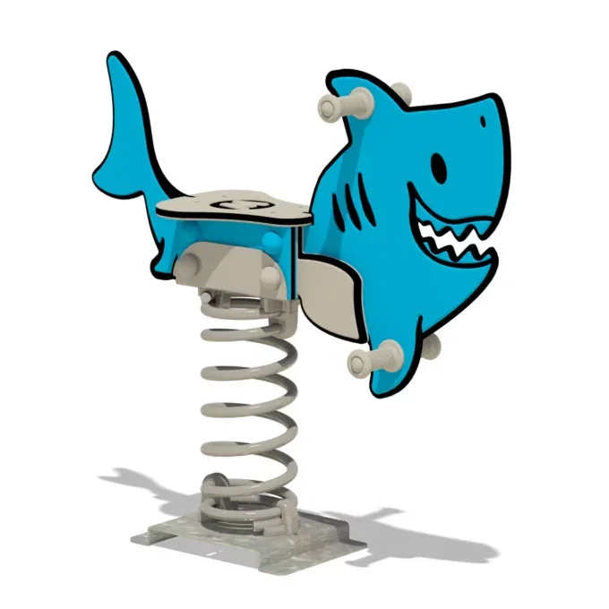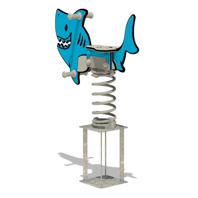 Zusätzlich sorgen die verstärkten Kunststoffhandgriffe und Fußstützen mit Anti-Rutsch-Profil dafür, dass die kleinen Haifahrer jederzeit einen sicheren Halt haben. Die Feder aus pulverbeschichtetem Stahl ermöglicht ein sanftes und kontrolliertes Wippen. Die feuerverzinkte Stahlverankerung erlaubt eine einfache Montage, sei es durch Einbetonieren oder Verschrauben, sodass „Charley“ stabil ist, auch bei intensivem Spielvergnügen.